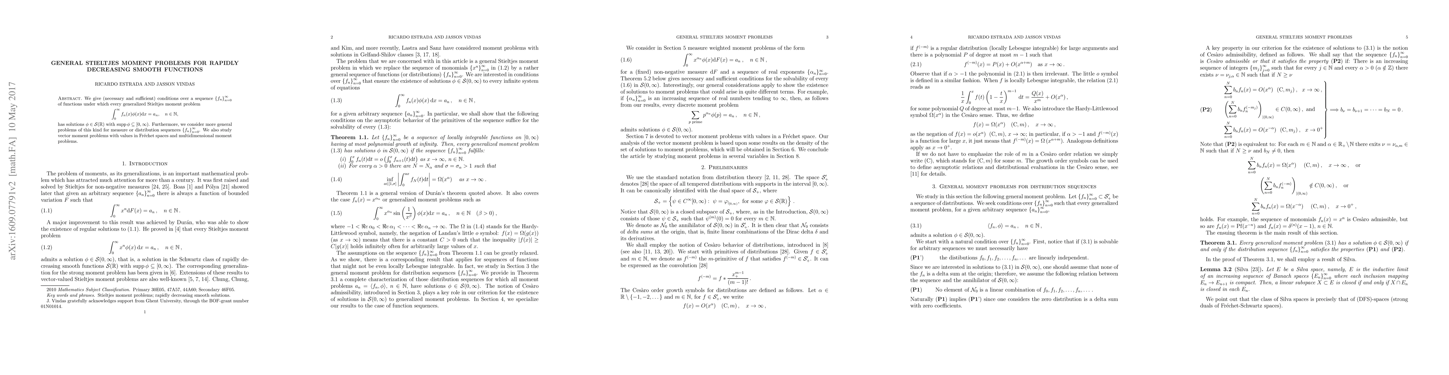 Research provides necessary and sufficient conditions for generalized Stieltjes moment problems to have solutions with support in [0,∞) for sequences of functions that decrease rapidly as n increases.