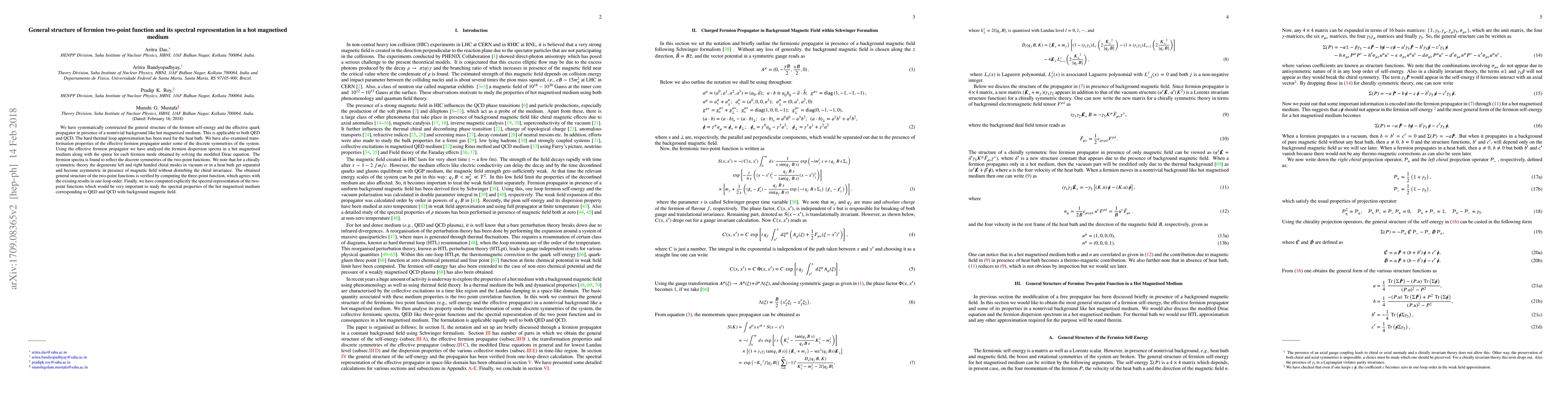 We have systematically constructed the general structure of the fermion self-energy and the effective quark propagator in presence of a nontrivial background like hot magnetised medium. This is applicable to both QED and QCD. The hard thermal loop approximation has been used for the heat bath. We have also examined transformation properties of the effective fermion propagator under some of the discrete symmetries of the system. Using the effective fermion propagator we have analysed the fermion dispersion spectra in a hot magnetised medium along with the spinor for each fermion mode obtained by solving the modified Dirac equation. The fermion spectra is found to reflect the discrete symmetries of the two-point functions. We note that for a chirally symmetric theory the degenerate left and right handed chiral modes in vacuum or in a heat bath get separated and become asymmetric in presence of magnetic field without disturbing the chiral invariance. The obtained general structure of the two-point functions is verified by computing the three-point function, which agrees with the existing results in one-loop order. Finally, we have computed explicitly the spectral representation of the two-point functions which would be very important to study the spectral properties of the hot magnetised medium corresponding to QED and QCD with background magnetic field.