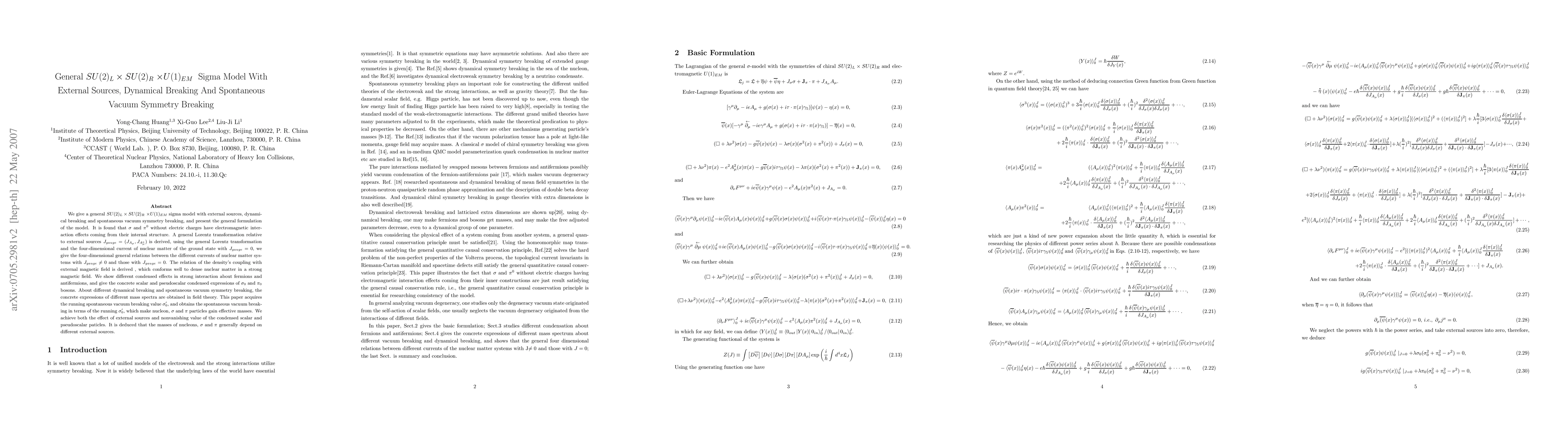 We give a general $SU(2)_L\times SU(2)_R$ $\times U(1)_{EM}$ sigma model with external sources, dynamical breaking and spontaneous vacuum symmetry breaking, and present the general formulation of the model. It is found that $\sigma $ and $\pi ^0$ without electric charges have electromagnetic interaction effects coming from their internal structure. A general Lorentz transformation relative to external sources $J_{gauge}$ $=(J_{A_\mu},J_{A_\mu ^\kappa})$ is derived, using the general Lorentz transformation and the four-dimensional current of nuclear matter of the ground state with $J_{gauge}$ = 0, we give the four-dimensional general relations between the different currents of nuclear matter systems with $J_{gauge}\neq 0$ and those with $J_{gauge}=0$. The relation of the density's coupling with external magnetic field is derived, which conforms well to dense nuclear matter in a strong magnetic field. We show different condensed effects in strong interaction about fermions and antifermions, and give the concrete scalar and pseudoscalar condensed expressions of $\sigma_0$ and $\pi_0$ bosons. About different dynamical breaking and spontaneous vacuum symmetry breaking, the concrete expressions of different mass spectra are obtained in field theory. This paper acquires the running spontaneous vacuum breaking value $\sigma_0^{\prime},$ and obtains the spontaneous vacuum breaking in terms of the running $\sigma_0^{\prime}$, which make nucleon, $\sigma $ and $\pi $ particles gain effective masses. We achieve both the effect of external sources and nonvanishing value of the condensed scalar and pseudoscalar paticles. It is deduced that the masses of nucleons, $\sigma $ and $\pi $ generally depend on different external sources.