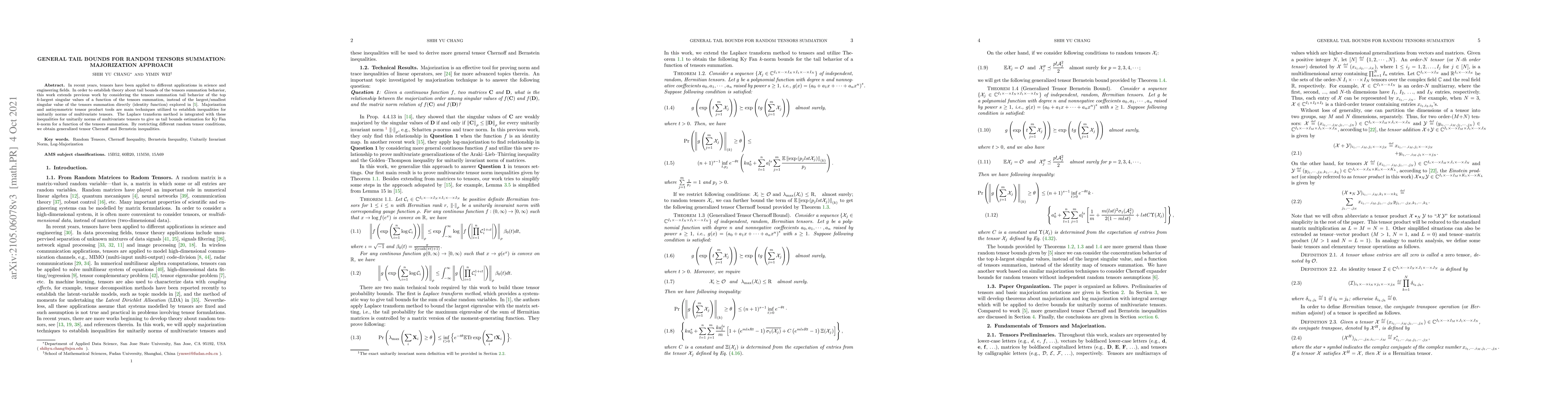 In recent years, tensors have been applied to different applications in science and engineering fields. In order to establish theory about tail bounds of the tensors summation behavior, this work extends previous work by considering the tensors summation tail behavior of the top $k$-largest singular values of a function of the tensors summation, instead of the largest/smallest singular value of the tensors summation directly (identity function) explored in Shih Yu's work: Convenient tail bounds for sums of random tensors. Majorization and antisymmetric tensor product tools are main techniques utilized to establish inequalities for unitarily norms of multivariate tensors. The Laplace transform method is integrated with these inequalities for unitarily norms of multivariate tensors to give us tail bounds estimation for Ky Fan $k$-norm for a function of the tensors summation. By restricting different random tensor conditions, we obtain generalized tensor Chernoff and Bernstein inequalities.