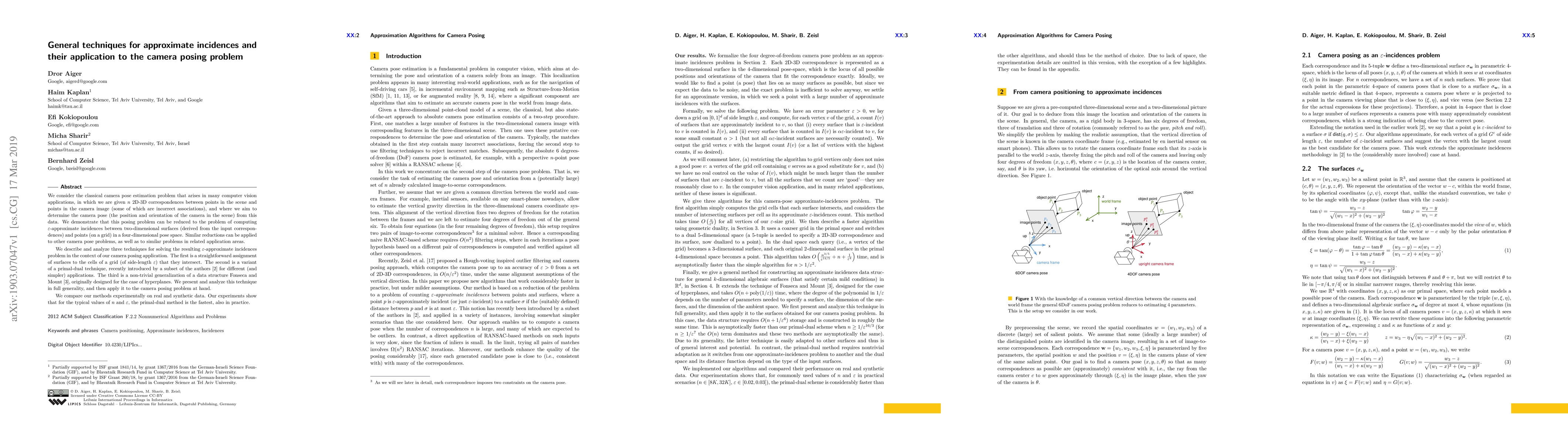 We consider the classical camera pose estimation problem that arises in many computer vision applications, in which we are given n 2D-3D correspondences between points in the scene and points in the camera image (some of which are incorrect associations), and where we aim to determine the camera pose (the position and orientation of the camera in the scene) from this data. We demonstrate that this posing problem can be reduced to the problem of computing {\epsilon}-approximate incidences between two-dimensional surfaces (derived from the input correspondences) and points (on a grid) in a four-dimensional pose space. Similar reductions can be applied to other camera pose problems, as well as to similar problems in related application areas. We describe and analyze three techniques for solving the resulting {\epsilon}-approximate incidences problem in the context of our camera posing application. The first is a straightforward assignment of surfaces to the cells of a grid (of side-length {\epsilon}) that they intersect. The second is a variant of a primal-dual technique, recently introduced by a subset of the authors [2] for different (and simpler) applications. The third is a non-trivial generalization of a data structure Fonseca and Mount [3], originally designed for the case of hyperplanes. We present and analyze this technique in full generality, and then apply it to the camera posing problem at hand. We compare our methods experimentally on real and synthetic data. Our experiments show that for the typical values of n and {\epsilon}, the primal-dual method is the fastest, also in practice.