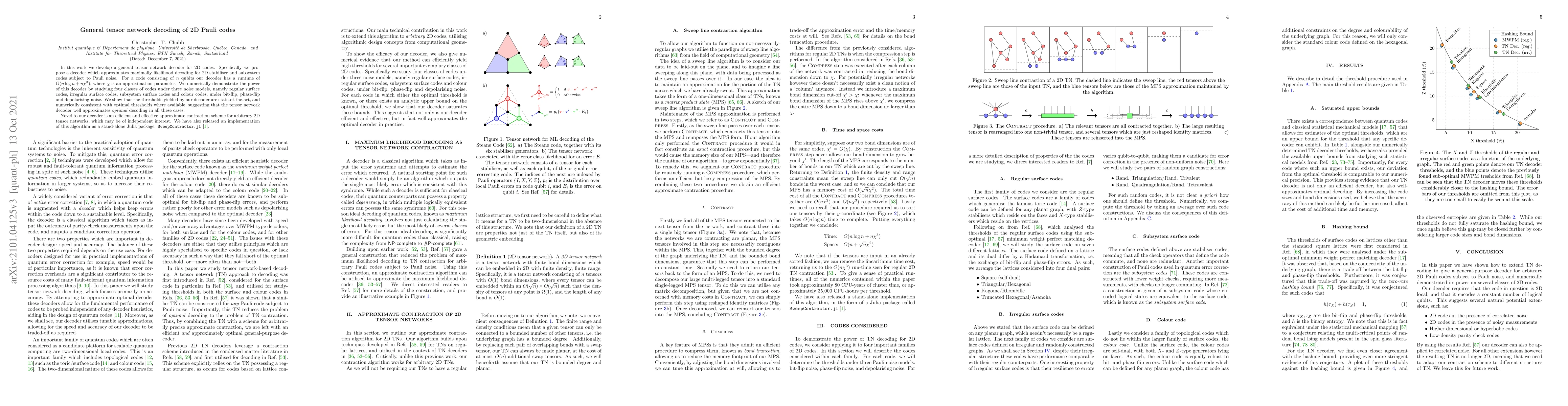 This paper introduces a tensor network decoder for 2D Pauli codes, achieving state-of-the-art performance under various noise models. The decoder approximates maximum likelihood decoding with a runtime of $O(n\log n+n\chi^3)$.