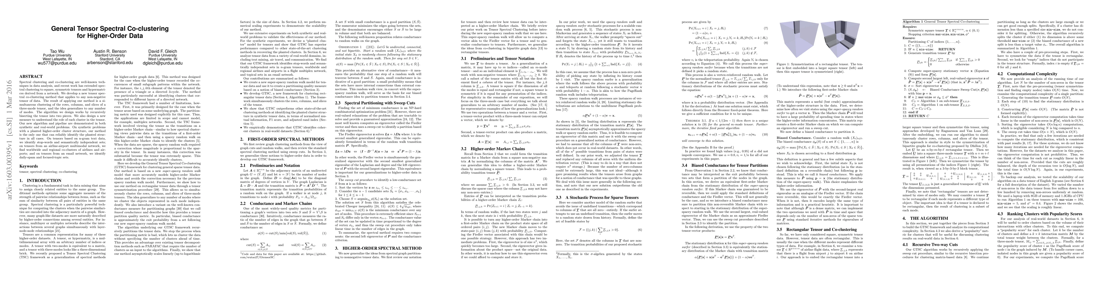 The paper introduces General Tensor Spectral Co-clustering (GTSC), a method for clustering higher-order data using a stochastic process called the super-spacey random walk, which is a variant of a higher-order Markov chain. The algorithm employs an iterative solver and a sweep cut procedure for biased conductance to achieve near-linear complexity in the number of non-zeros in tensors.