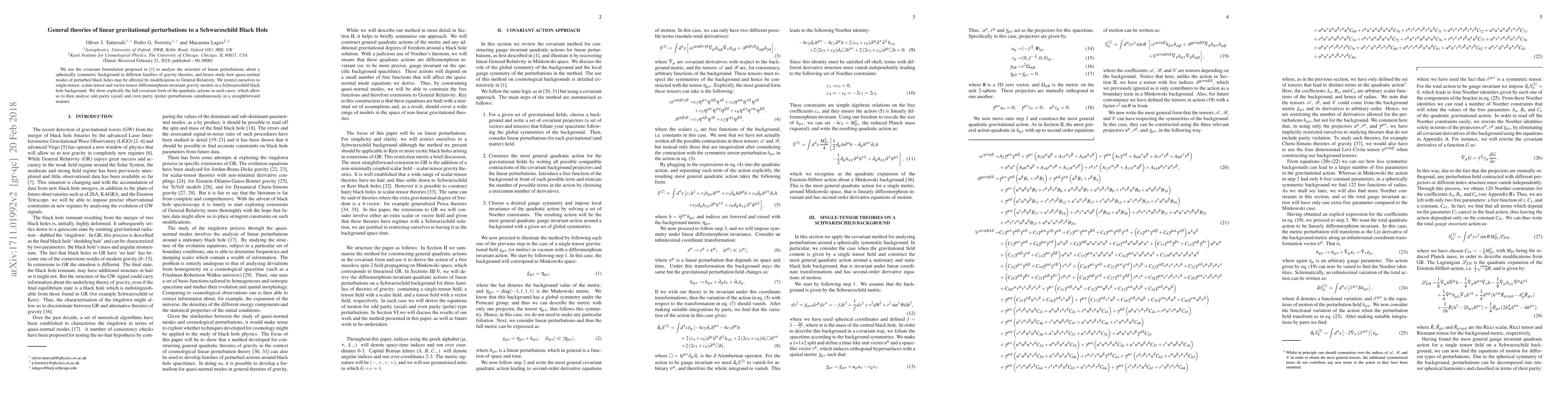 This paper analyzes linear gravitational perturbations around a Schwarzschild black hole using a covariant formulation, focusing on how quasi-normal modes may change under modifications to General Relativity in single-tensor, scalar-tensor, and vector-tensor gravity models. The study provides the full covariant form of the quadratic actions for these models to analyze both odd and even parity perturbations.