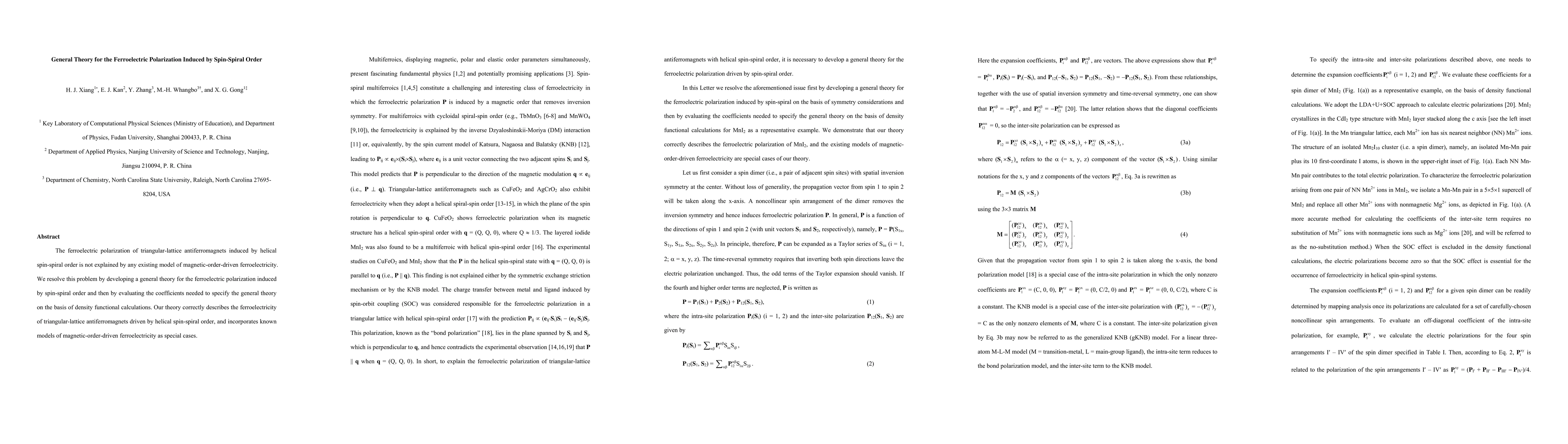 This paper develops a general theory explaining ferroelectric polarization in triangular-lattice antiferromagnets induced by helical spin-spiral order, resolving existing model limitations. The theory is validated using density functional calculations and encompasses known models as special cases.