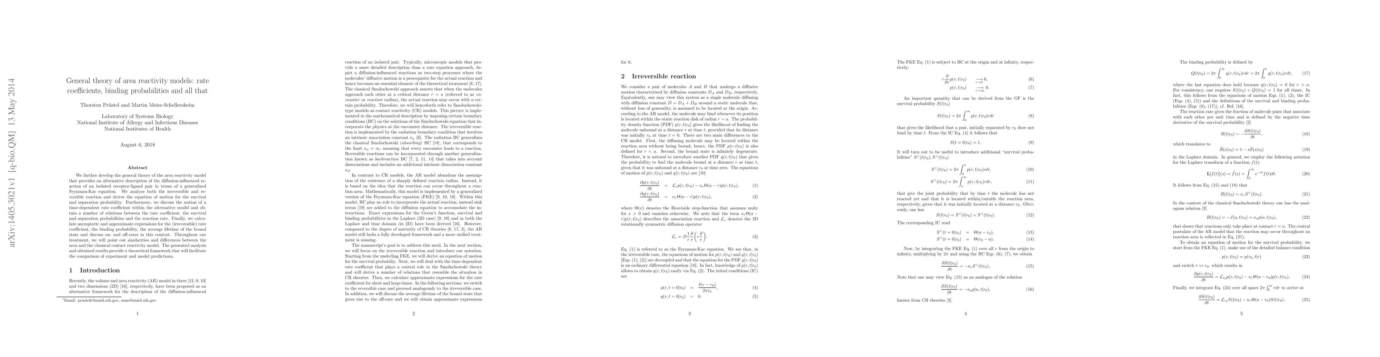 This paper develops a general theory for the area reactivity model, providing a Feynman-Kac equation description of receptor-ligand interactions. It derives equations for survival and separation probabilities, discusses time-dependent rate coefficients, and compares the area model with the classical contact reactivity model.
