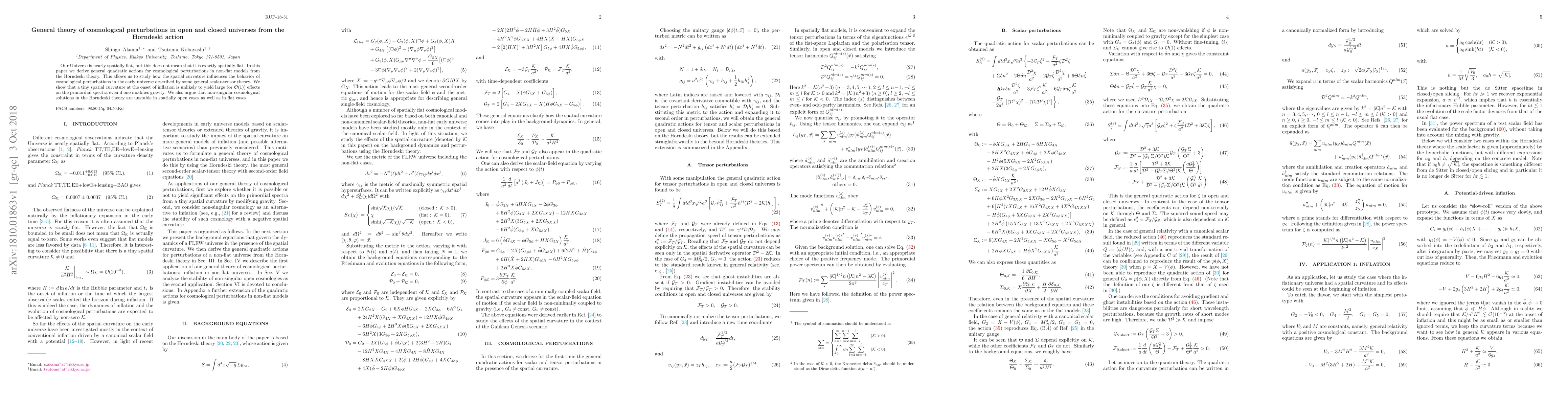 This paper derives general quadratic actions for cosmological perturbations in open and closed universes from the Horndeski theory, showing that small spatial curvature during inflation likely does not significantly affect primordial spectra. It also finds that non-singular cosmological solutions in the Horndeski theory are unstable in both open and flat spatial configurations.