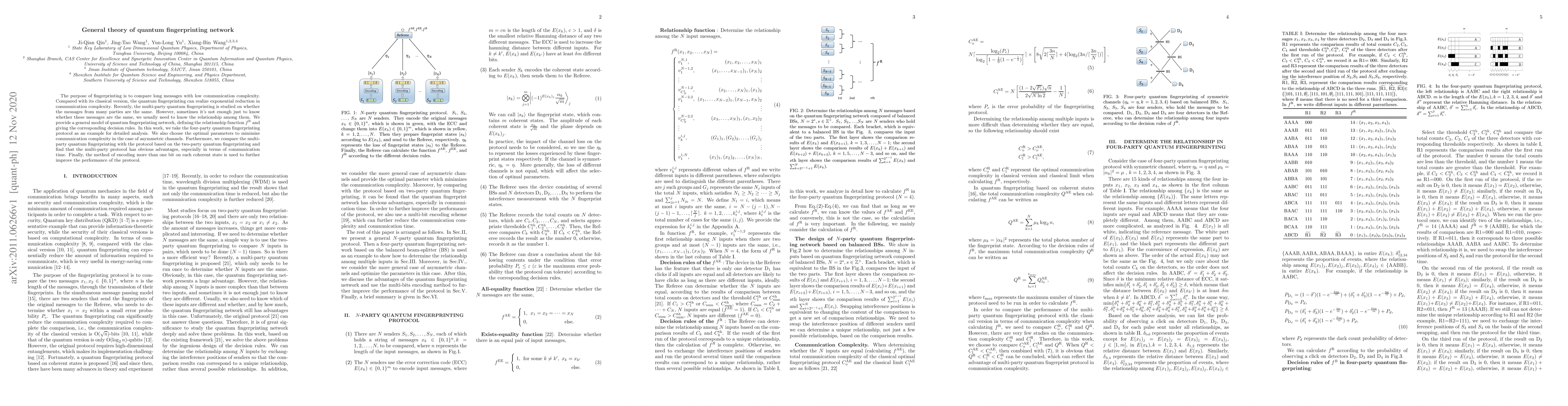 The purpose of fingerprinting is to compare long messages with low communication complexity. Compared with its classical version, the quantum fingerprinting can realize exponential reduction in communication complexity. Recently, the multi-party quantum fingerprinting is studied on whether the messages from many parties are the same. However, sometimes it is not enough just to know whether these messages are the same, we usually need to know the relationship among them. We provide a general model of quantum fingerprinting network, defining the relationship function $f^R$ and giving the corresponding decision rules. In this work, we take the four-party quantum fingerprinting protocol as an example for detailed analysis. We also choose the optimal parameters to minimize communication complexity in the case of asymmetric channels. Furthermore, we compare the multi-party quantum fingerprinting with the protocol based on the two-party quantum fingerprinting and find that the multi-party protocol has obvious advantages, especially in terms of communication time. Finally, the method of encoding more than one bit on each coherent state is used to further improve the performance of the protocol.