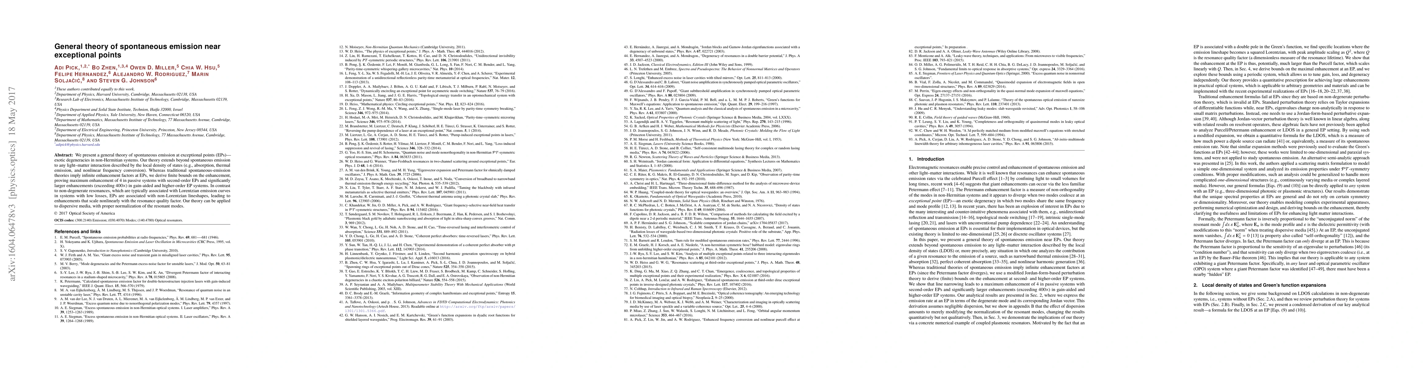 We present a general theory of spontaneous emission at exceptional points (EPs)---exotic degeneracies in non-Hermitian systems. Our theory extends beyond spontaneous emission to any light--matter interaction described by the local density of states (e.g., absorption, thermal emission, and nonlinear frequency conversion). Whereas traditional spontaneous-emission theories imply infinite enhancement factors at EPs, we derive finite bounds on the enhancement, proving maximum enhancement of 4 in passive systems with second-order EPs and significantly larger enhancements (exceeding $400\times$) in gain-aided and higher-order EP systems. In contrast to non-degenerate resonances, EPs are associated with non-Lorentzian emission curves, leading to enhancements that scale polynomially with the resonance quality factor.