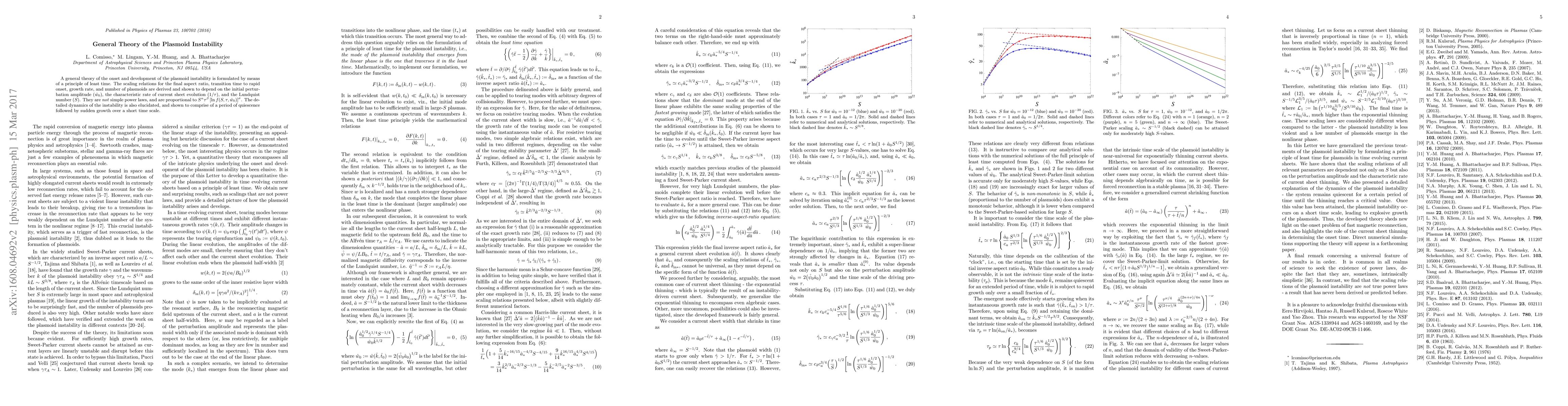 The paper presents a general theory for plasmoid instability, using a principle of least time. It derives scaling relations for instability features, showing they depend on initial perturbation amplitude, current sheet evolution rate, and Lundquist number. The dynamics are described as a quiescent period followed by rapid growth.