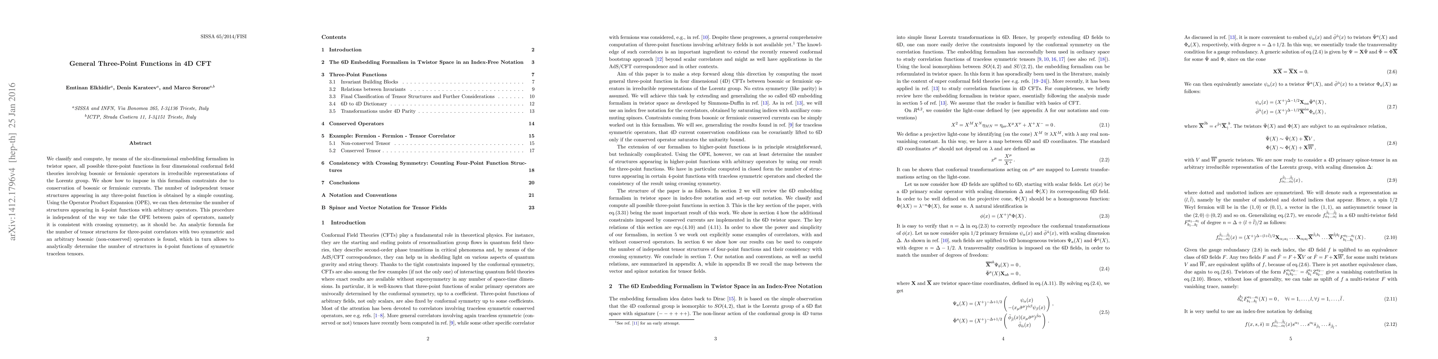 This paper classifies and computes all three-point functions in 4D conformal field theories using the six-dimensional embedding formalism in twistor space, revealing the independent tensor structures and imposing constraints from current conservation. It also determines the number of structures in 4-point functions via the Operator Product Expansion, confirming consistency with crossing symmetry.