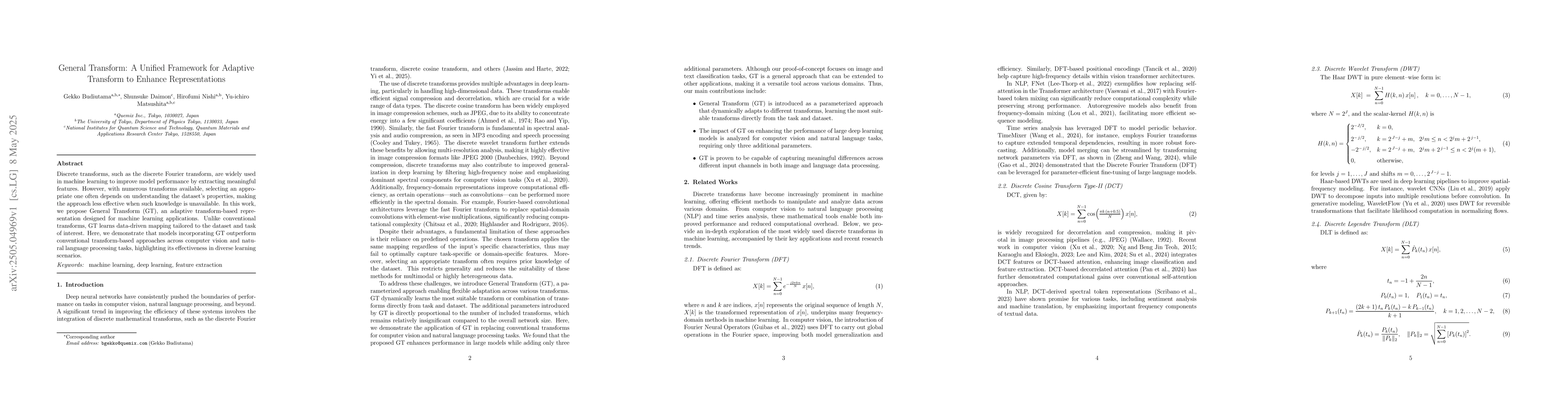 Discrete transforms, such as the discrete Fourier transform, are widely used in machine learning to improve model performance by extracting meaningful features. However, with numerous transforms available, selecting an appropriate one often depends on understanding the dataset's properties, making the approach less effective when such knowledge is unavailable. In this work, we propose General Transform (GT), an adaptive transform-based representation designed for machine learning applications. Unlike conventional transforms, GT learns data-driven mapping tailored to the dataset and task of interest. Here, we demonstrate that models incorporating GT outperform conventional transform-based approaches across computer vision and natural language processing tasks, highlighting its effectiveness in diverse learning scenarios.