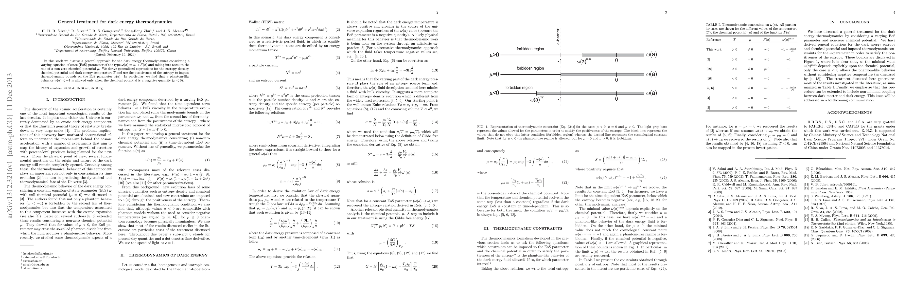 In this work we discuss a general approach for the dark energy thermodynamics considering a varying equation of state (EoS) parameter of the type $\omega(a)=\omega_0+F(a)$ and taking into account the role of a non-zero chemical potential $\mu$. We derive generalized expressions for the entropy density, chemical potential and dark energy temperature $T$ and use the positiveness of the entropy to impose thermodynamic bounds on the EoS parameter $\omega(a)$. In particular, we find that a phantom-like behavior $\omega(a)< -1$ is allowed only when the chemical potential assumes negative values ($\mu<0$).