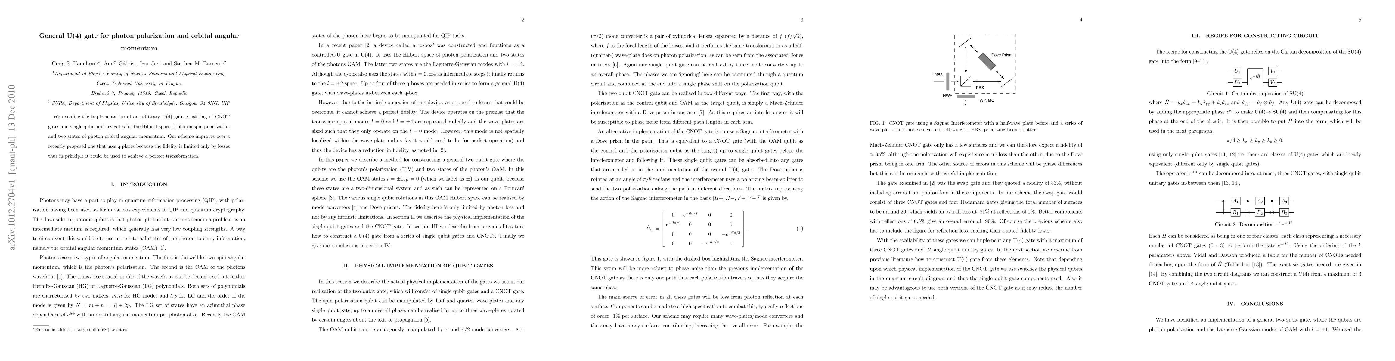 We examine the implementation of an arbitrary U(4) gate consisting of CNOT gates and single qubit unitary gates for the Hilbert space of photon spin polarization and two states of photon orbital angular momentum. Our scheme improves over a recently proposed one that uses q-plates because the fidelity is limited only by losses thus in principle it could be used to achieve a perfect transformation.