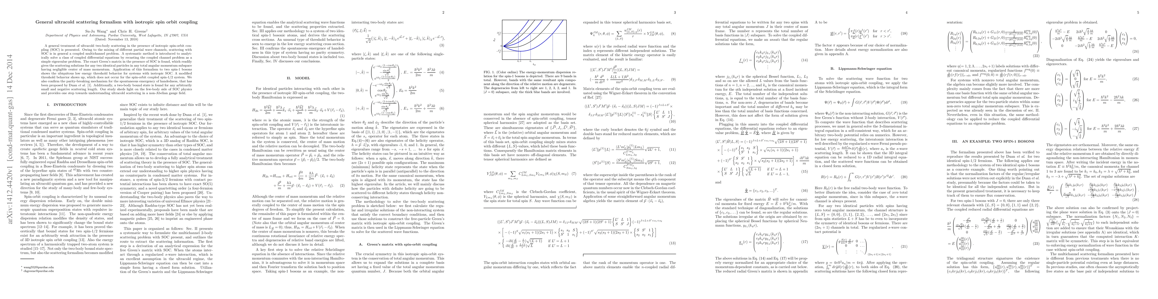This paper presents a formalism for ultracold two-body scattering involving isotropic spin-orbit coupling, solving coupled differential equations via an eigenvalue problem. It demonstrates unique threshold behaviors and spontaneous handedness emergence in spin-1 bosons, and identifies a bound state for small scattering lengths, advancing the understanding of few-body systems with spin-orbit coupling.