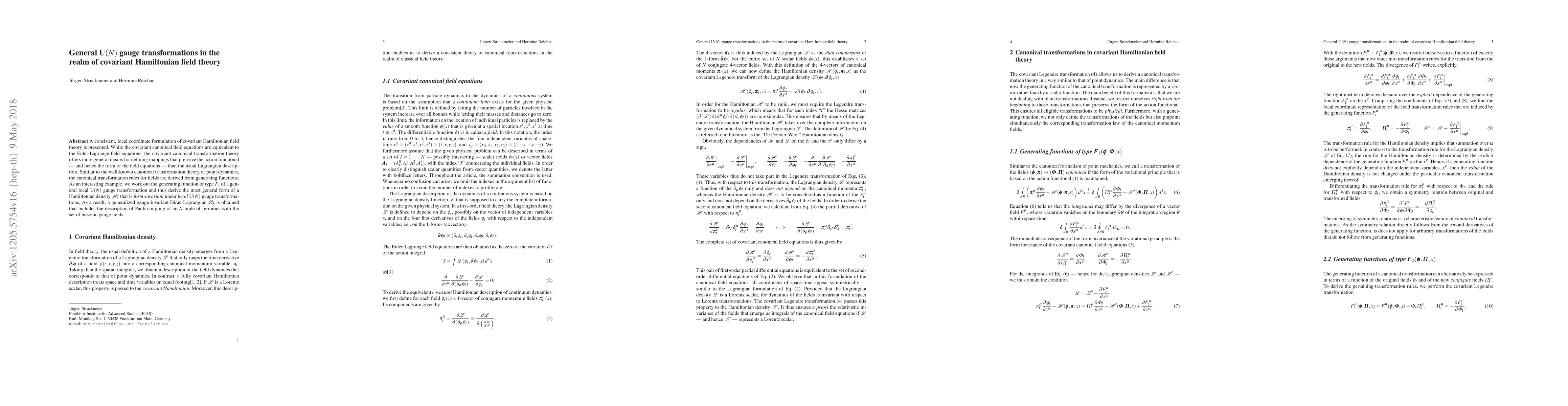 This paper presents a local coordinate formulation of covariant Hamiltonian field theory, showing that canonical transformations preserve the action functional and field equations. It derives the generating function for a general local U(N) gauge transformation, leading to the most general form of a Hamiltonian density invariant under such transformations.