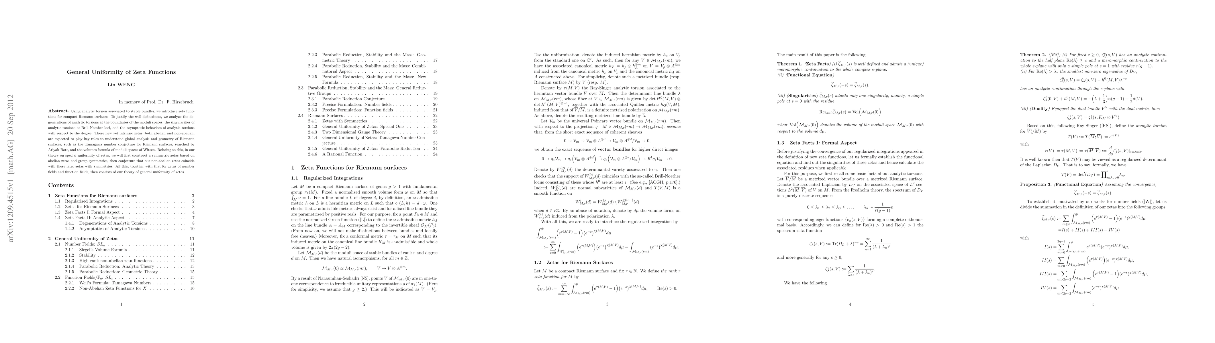 Using analytic torsion associated to stable bundles, we introduce zeta functions for compact Riemann surfaces. To justify the well-definedness, we analyze the degenerations of analytic torsions at the boundaries of the moduli spaces, the singularities of analytic torsions at Brill-Noether loci, and the asymptotic behaviors of analytic torsions with respect to the degree. These new yet intrinsic zetas, both abelian and non-abelian, are expected to play key roles to understand global analysis and geometry of Riemann surfaces, such as the Tamagawa number conjecture for Riemann surfaces, searched by Atiyah-Bott, and the volumes formula of moduli spaces of Witten. Relating to this, in our theory on special uniformity of zetas, we will first construct a symmetric zetas based on abelian zetas and group symmetries, then conjecture that our non-abelian zetas coincide with these later zetas with symmetries. All this, together with that for zetas of number fields and function fields, then consists of our theory of general uniformity of zetas.