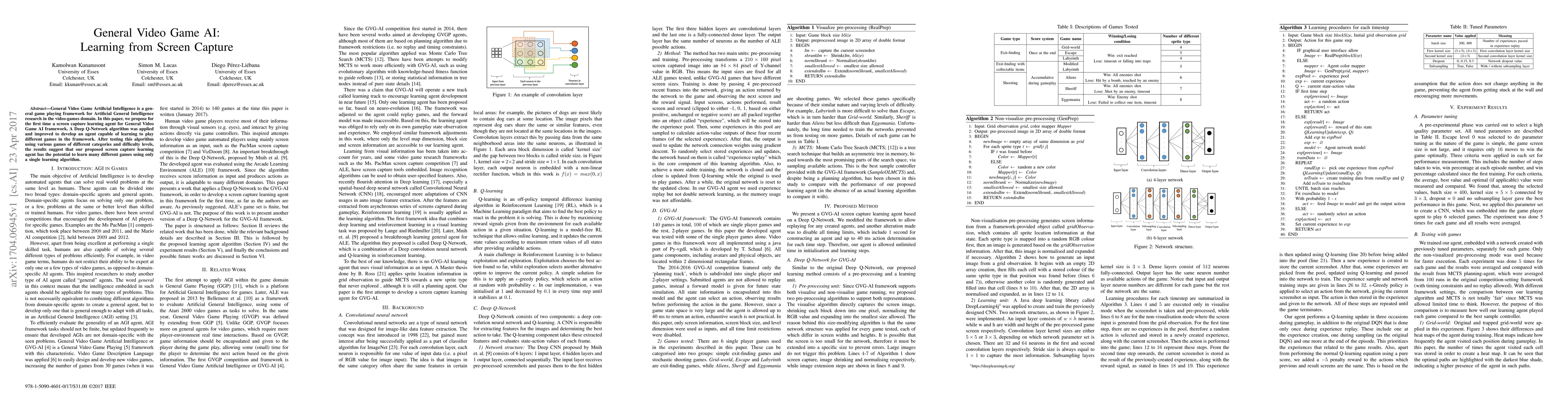 The paper presents an improved Deep Q-Network algorithm tailored for the General Video Game AI framework, enabling an agent to learn from screen captures across various game categories and difficulty levels.