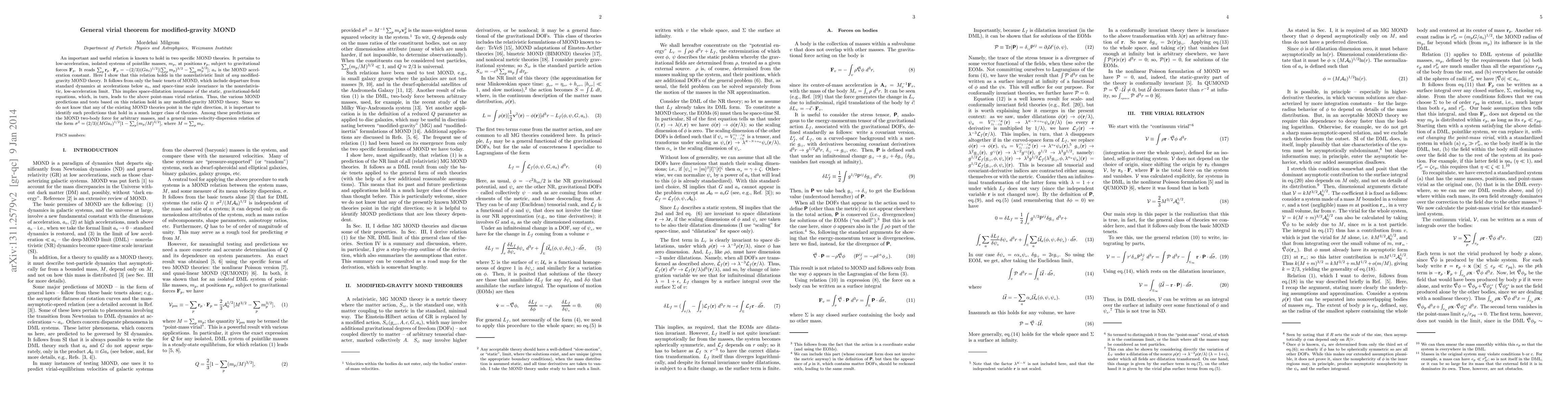 This paper demonstrates that a specific virial theorem relation holds in the nonrelativistic limit of any modified-gravity MOND theory, based on the fundamental principles of MOND. This finding extends the applicability of MOND predictions and tests to a broader class of theories, including the MOND two-body force and a general mass-velocity-dispersion relation.