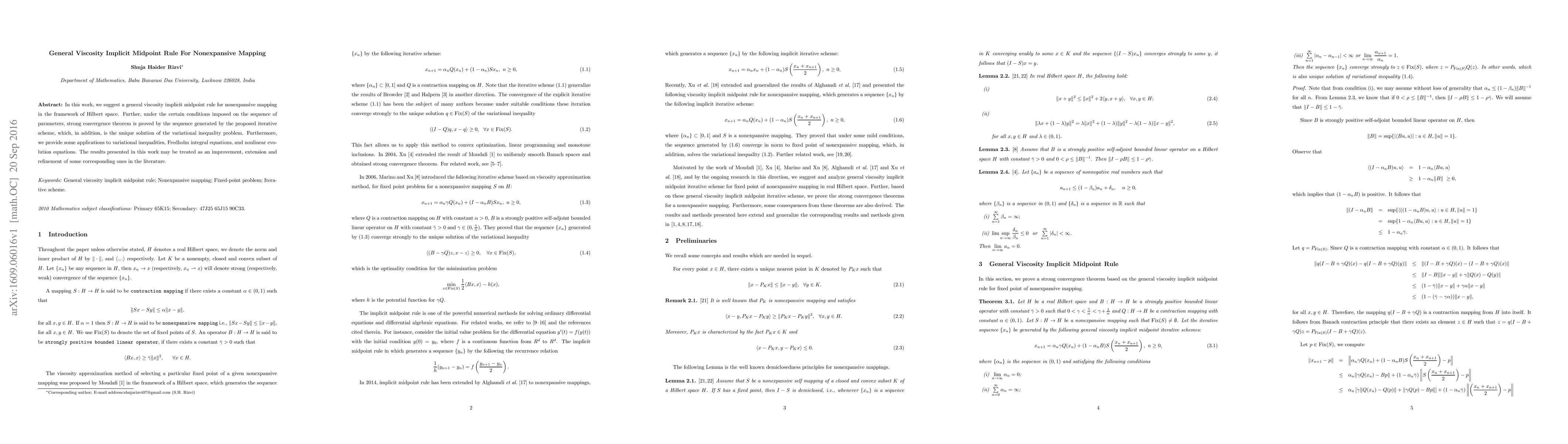 This paper proposes a general viscosity implicit midpoint rule for nonexpansive mappings in Hilbert spaces, proving strong convergence under specific conditions. The method is shown to uniquely solve variational inequality problems and is applied to variational inequalities, Fredholm integral equations, and nonlinear evolution equations.