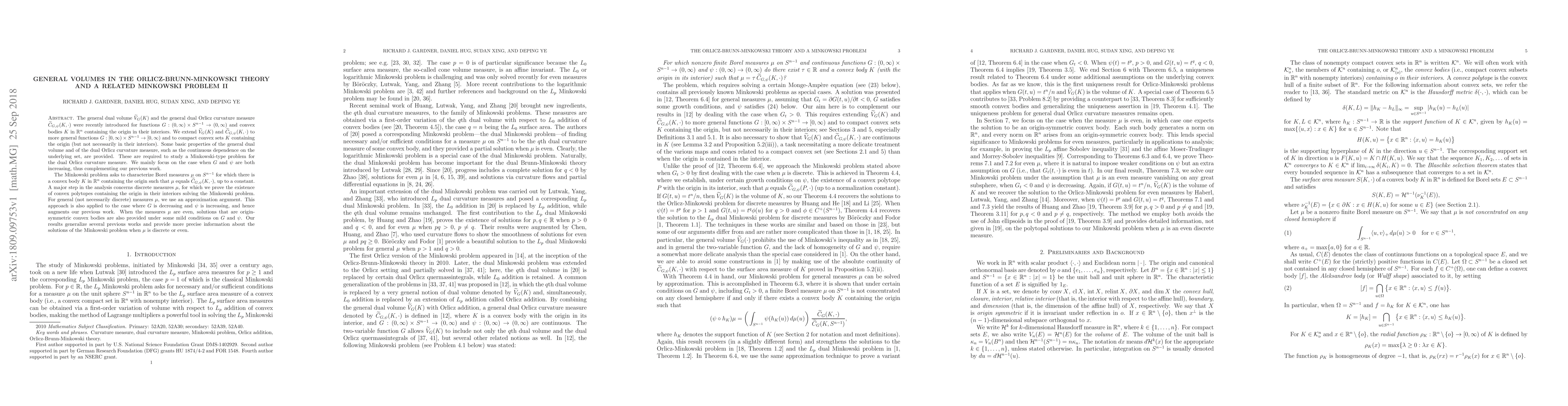 The general dual volume $\dveV(K)$ and the general dual Orlicz curvature measure $\deV(K, \cdot)$ were recently introduced for functions $G: (0, \infty)\times \sphere\rightarrow (0, \infty)$ and convex bodies $K$ in $\R^n$ containing the origin in their interiors. We extend $\dveV(K)$ and $\deV(K, \cdot)$ to more general functions $G: [0, \infty)\times \sphere\rightarrow [0, \infty)$ and to compact convex sets $K$ containing the origin (but not necessarily in their interiors). Some basic properties of the general dual volume and of the dual Orlicz curvature measure, such as the continuous dependence on the underlying set, are provided. These are required to study a Minkowski-type problem for the dual Orlicz curvature measure. We mainly focus on the case when $G$ and $\psi$ are both increasing, thus complementing our previous work. The Minkowski problem asks to characterize Borel measures $\mu$ on $\sphere$ for which there is a convex body $K$ in $\R^n$ containing the origin such that $\mu$ equals $\deV(K, \cdot)$, up to a constant. A major step in the analysis concerns discrete measures $\mu$, for which we prove the existence of convex polytopes containing the origin in their interiors solving the Minkowski problem. For general (not necessarily discrete) measures $\mu$, we use an approximation argument. This approach is also applied to the case where $G$ is decreasing and $\psi$ is increasing, and hence augments our previous work. When the measures $\mu$ are even, solutions that are origin-symmetric convex bodies are also provided under some mild conditions on $G$ and $\psi$. Our results generalize several previous works and provide more precise information about the solutions of the Minkowski problem when $\mu$ is discrete or even.