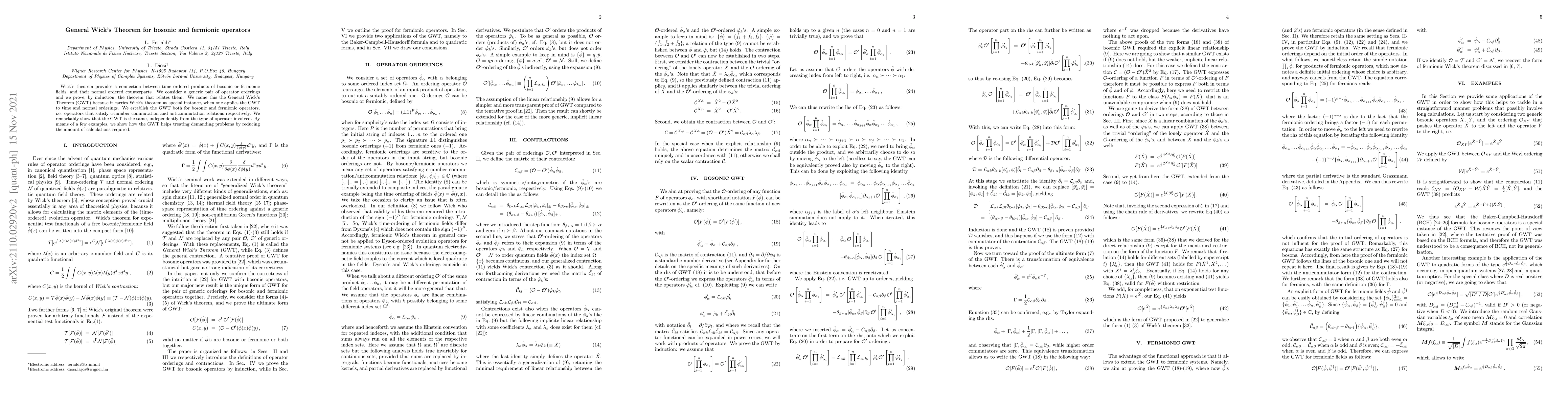 The General Wick's Theorem (GWT) connects time-ordered products with normal-ordered counterparts for both bosonic and fermionic operators. The GWT, proven by induction, applies universally to both types of operators, simplifying complex calculations.