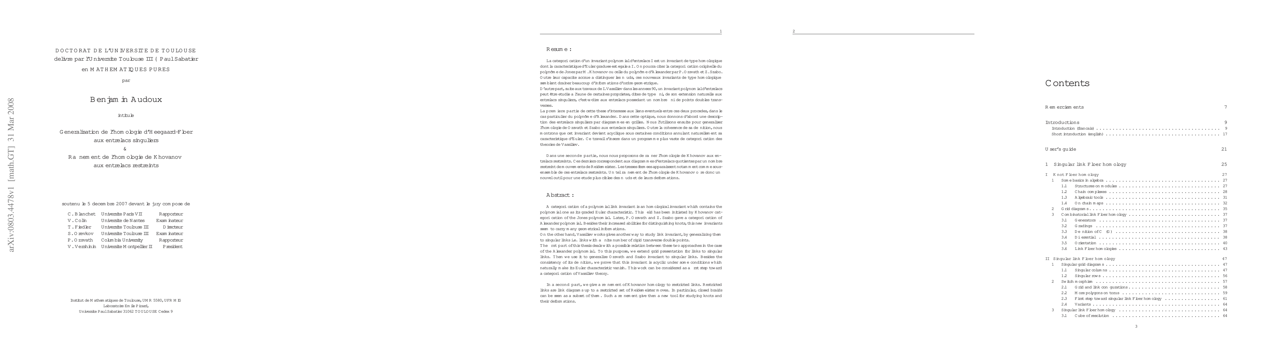 A categorification of a polynomial link invariant is an homological invariant which contains the polynomial one as its graded Euler characteristic. This field has been initiated by Khovanov categorification of the Jones polynomial. Later, P. Ozsvath and Z. Szabo gave a categorification of Alexander polynomial. Besides their increased abilities for distinguishing knots, this new invariants seem to carry many geometrical informations. On the other hand, Vassiliev works gives another way to study link invariant, by generalizing them to singular links i.e. links with a finite number of rigid transverse double points. The first part of this thesis deals with a possible relation between these two approaches in the case of the Alexander polynomial. To this purpose, we extend grid presentation for links to singular links. Then we use it to generalize Ozsvath and Szabo invariant to singular links. Besides the consistency of its definition, we prove that this invariant is acyclic under some conditions which naturally make its Euler characteristic vanish. This work can be considered as a first step toward a categorification of Vassiliev theory. In a second part, we give a refinement of Khovanov homology to restricted links. Restricted links are link diagrams up to a restricted set of Reidemeister moves. In particular, closed braids can be seen as a subset of them. Such a refinement give then a new tool for studying knots and their deformations.