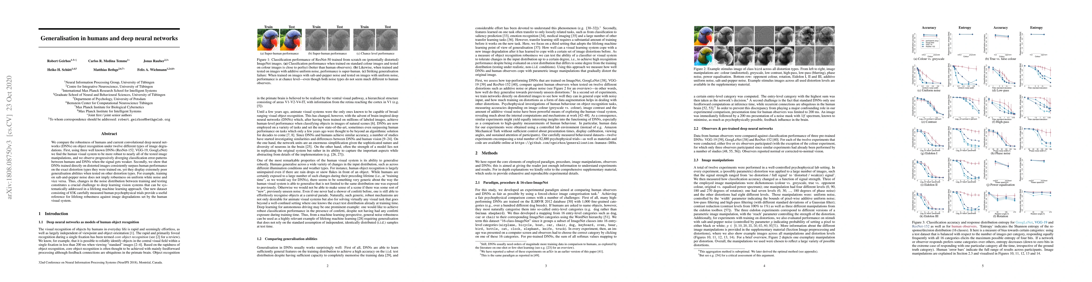 We compare the robustness of humans and current convolutional deep neural networks (DNNs) on object recognition under twelve different types of image degradations. First, using three well known DNNs (ResNet-152, VGG-19, GoogLeNet) we find the human visual system to be more robust to nearly all of the tested image manipulations, and we observe progressively diverging classification error-patterns between humans and DNNs when the signal gets weaker. Secondly, we show that DNNs trained directly on distorted images consistently surpass human performance on the exact distortion types they were trained on, yet they display extremely poor generalisation abilities when tested on other distortion types. For example, training on salt-and-pepper noise does not imply robustness on uniform white noise and vice versa. Thus, changes in the noise distribution between training and testing constitutes a crucial challenge to deep learning vision systems that can be systematically addressed in a lifelong machine learning approach. Our new dataset consisting of 83K carefully measured human psychophysical trials provide a useful reference for lifelong robustness against image degradations set by the human visual system.