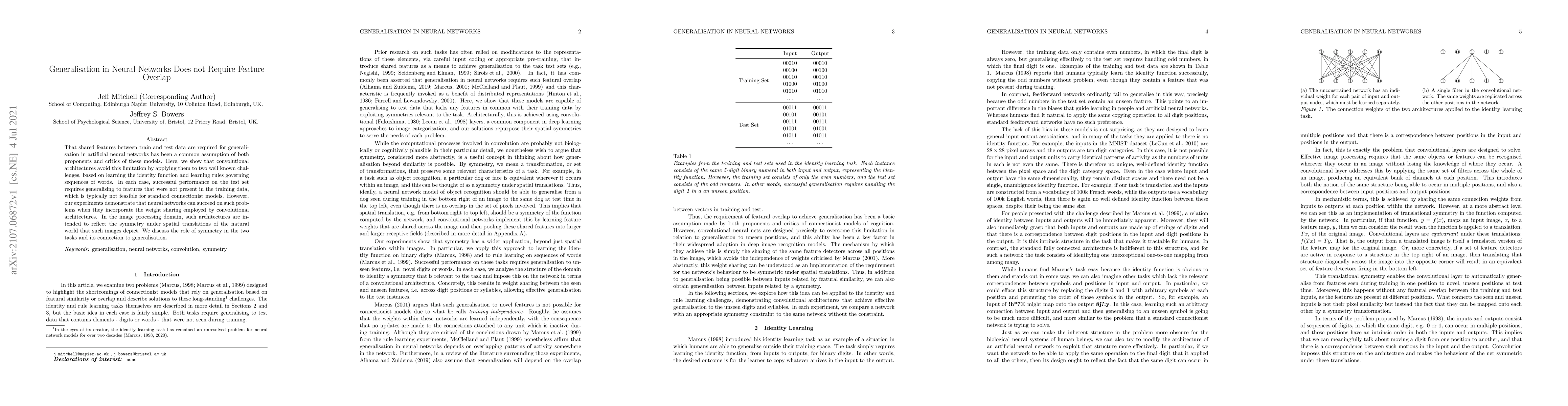 That shared features between train and test data are required for generalisation in artificial neural networks has been a common assumption of both proponents and critics of these models. Here, we show that convolutional architectures avoid this limitation by applying them to two well known challenges, based on learning the identity function and learning rules governing sequences of words. In each case, successful performance on the test set requires generalising to features that were not present in the training data, which is typically not feasible for standard connectionist models. However, our experiments demonstrate that neural networks can succeed on such problems when they incorporate the weight sharing employed by convolutional architectures. In the image processing domain, such architectures are intended to reflect the symmetry under spatial translations of the natural world that such images depict. We discuss the role of symmetry in the two tasks and its connection to generalisation.