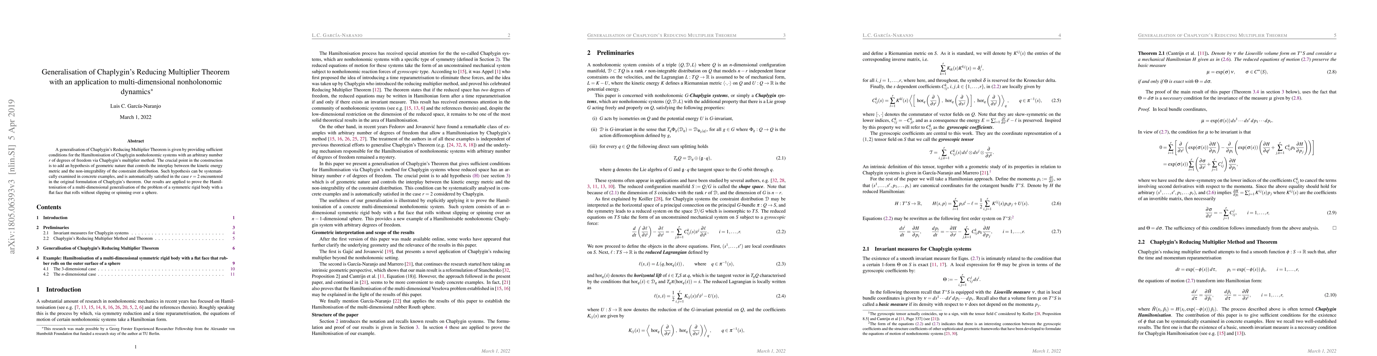 A generalisation of Chaplygin's Reducing Multiplier Theorem is given by providing sufficient conditions for the Hamiltonisation of Chaplygin nonholonomic systems with an arbitrary number $r$ of degrees of freedom via Chaplygin's multiplier method. The crucial point in the construction is to add an hypothesis of geometric nature that controls the interplay between the kinetic energy metric and the non-integrability of the constraint distribution. Such hypothesis can be systematically examined in concrete examples, and is automatically satisfied in the case $r= 2$ encountered in the original formulation of Chaplygin's theorem. Our results are applied to prove the Hamiltonisation of a multi-dimensional generalisation of the problem of a symmetric rigid body with a flat face that rolls without slipping or spinning over a sphere.
