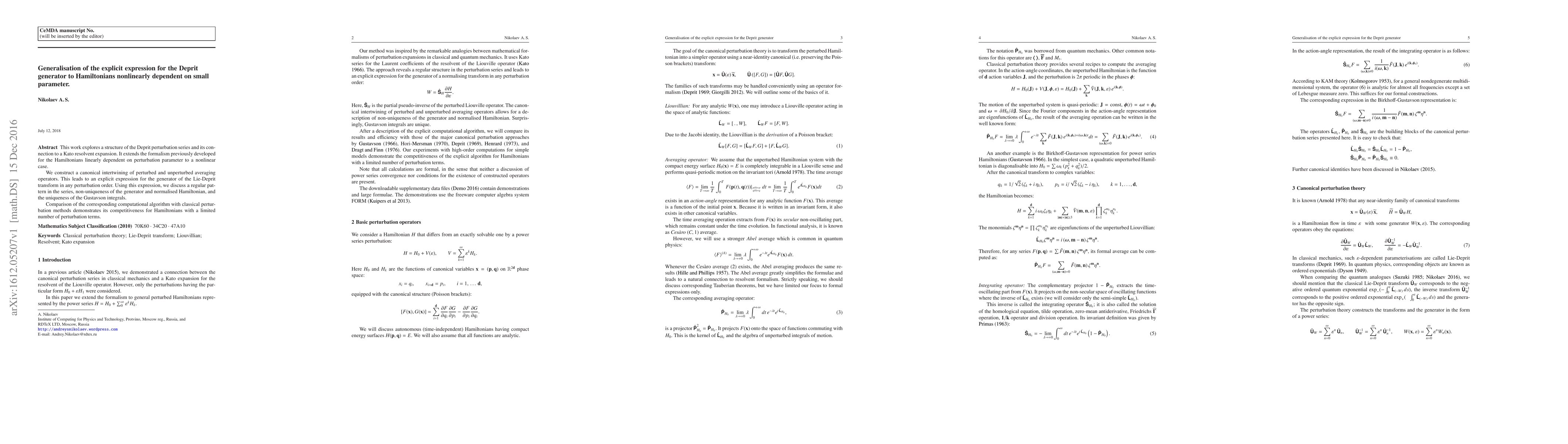 This work explores a structure of the Deprit perturbation series and its connection to a Kato resolvent expansion. It extends the formalism previously developed for the Hamiltonians linearly dependent on perturbation parameter to a nonlinear case. We construct a canonical intertwining of perturbed and unperturbed averaging operators. This leads to an explicit expression for the generator of the Lie-Deprit transform in any perturbation order. Using this expression, we discuss a regular pattern in the series, non-uniqueness of the generator and normalised Hamiltonian, and the uniqueness of the Gustavson integrals. Comparison of the corresponding computational algorithm with classical perturbation methods demonstrates its competitiveness for Hamiltonians with a limited number of perturbation terms.