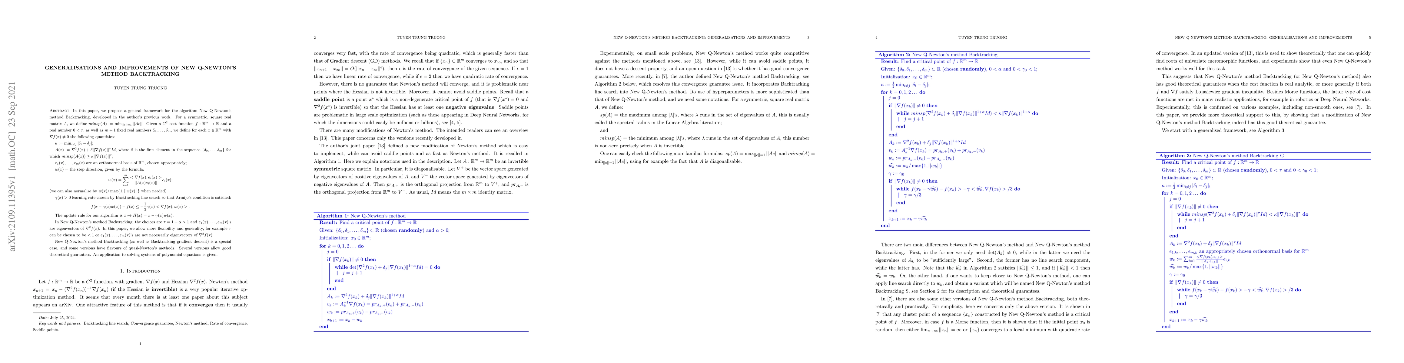 In this paper, we propose a general framework for the algorithm New Q-Newton's method Backtracking, developed in the author's previous work. For a symmetric, square real matrix $A$, we define $minsp(A):=\min _{||e||=1} ||Ae||$. Given a $C^2$ cost function $f:\mathbb{R}^m\rightarrow \mathbb{R}$ and a real number $0<\tau $, as well as $m+1$ fixed real numbers $\delta _0,\ldots ,\delta _m$, we define for each $x\in \mathbb{R}^m$ with $\nabla f(x)\not= 0$ the following quantities: $\kappa :=\min _{i\not= j}|\delta _i-\delta _j|$; $A(x):=\nabla ^2f(x)+\delta ||\nabla f(x)||^{\tau}Id$, where $\delta$ is the first element in the sequence $\{\delta _0,\ldots ,\delta _m\}$ for which $minsp(A(x))\geq \kappa ||\nabla f(x)||^{\tau}$; $e_1(x),\ldots ,e_m(x)$ are an orthonormal basis of $\mathbb{R}^m$, chosen appropriately; $w(x)=$ the step direction, given by the formula: $$w(x)=\sum _{i=1}^m\frac{<\nabla f(x),e_i(x)>}{||A(x)e_i(x)||}e_i(x);$$ (we can also normalise by $w(x)/\max \{1,||w(x)||\}$ when needed) $\gamma (x)>0$ learning rate chosen by Backtracking line search so that Armijo's condition is satisfied: $$f(x-\gamma (x)w(x))-f(x)\leq -\frac{1}{3}\gamma (x)<\nabla f(x),w(x)>.$$ The update rule for our algorithm is $x\mapsto H(x)=x-\gamma (x)w(x)$. In New Q-Newton's method Backtracking, the choices are $\tau =1+\alpha >1$ and $e_1(x),\ldots ,e_m(x)$'s are eigenvectors of $\nabla ^2f(x)$. In this paper, we allow more flexibility and generality, for example $\tau$ can be chosen to be $<1$ or $e_1(x),\ldots ,e_m(x)$'s are not necessarily eigenvectors of $\nabla ^2f(x)$. New Q-Newton's method Backtracking (as well as Backtracking gradient descent) is a special case, and some versions have flavours of quasi-Newton's methods. Several versions allow good theoretical guarantees. An application to solving systems of polynomial equations is given.