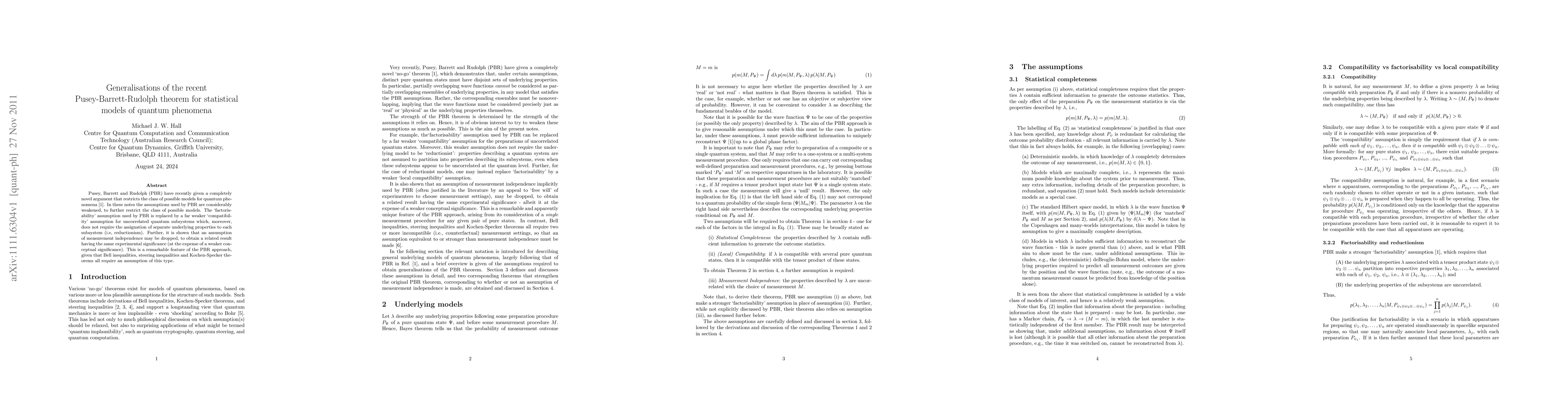 Pusey, Barrett and Rudolph (PBR) have recently given a completely novel argument that restricts the class of possible models for quantum phenomena (arXiv:1111.3328). In these notes the assumptions used by PBR are considerably weakened, to further restrict the class of possible models. The `factorisability' assumption used by PBR is replaced by a far weaker `compatibility' assumption for uncorrelated quantum subsystems which, moreover, does not require the assignation of separate underlying properties to each subsystem (i.e, reductionism). Further, it is shown that an assumption of measurement independence may be dropped to obtain a related result having the same experimental significance (at the expense of a weaker conceptual significance). The latter is a remarkable feature of the PBR approach, given that Bell inequalities, steering inequalities and Kochen-Specker theorems all require an assumption of this type.