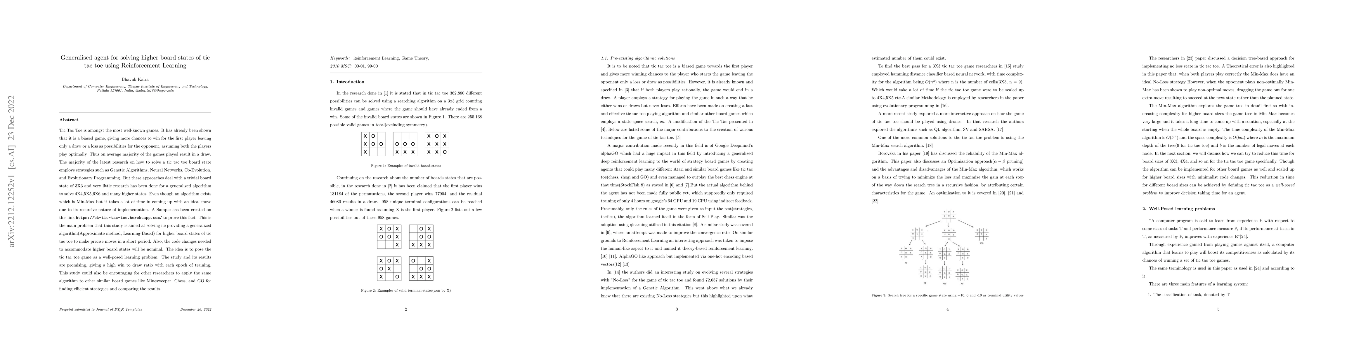 This paper proposes a reinforcement learning algorithm to solve higher board states of tic tac toe (4x4, 5x5, 6x6, etc.), addressing the lack of generalized solutions beyond the traditional 3x3 board. The study aims to provide efficient, learning-based strategies for quicker decision-making compared to traditional min-max algorithms.