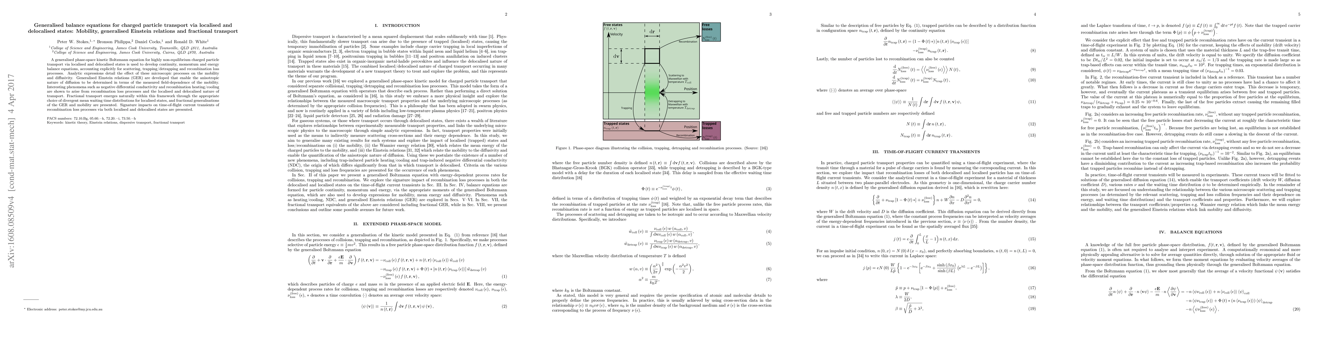 A generalised phase-space kinetic Boltzmann equation for highly non-equilibrium charged particle transport via localised and delocalised states is used to develop continuity, momentum and energy balance equations, accounting explicitly for scattering, trapping/detrapping and recombination loss processes. Analytic expressions detail the effect of these microscopic processes on the mobility and diffusivity. Generalised Einstein relations (GER) are developed that enable the anisotropic nature of diffusion to be determined in terms of the measured field-dependence of the mobility. Interesting phenomena such as negative differential conductivity and recombination heating/cooling are shown to arise from recombination loss processes and the localised and delocalised nature of transport. Fractional transport emerges naturally within this framework through the appropriate choice of divergent mean waiting time distributions for localised states, and fractional generalisations of the GER and mobility are presented. Signature impacts on time-of-flight current transients of recombination loss processes via both localised and delocalised states are presented.