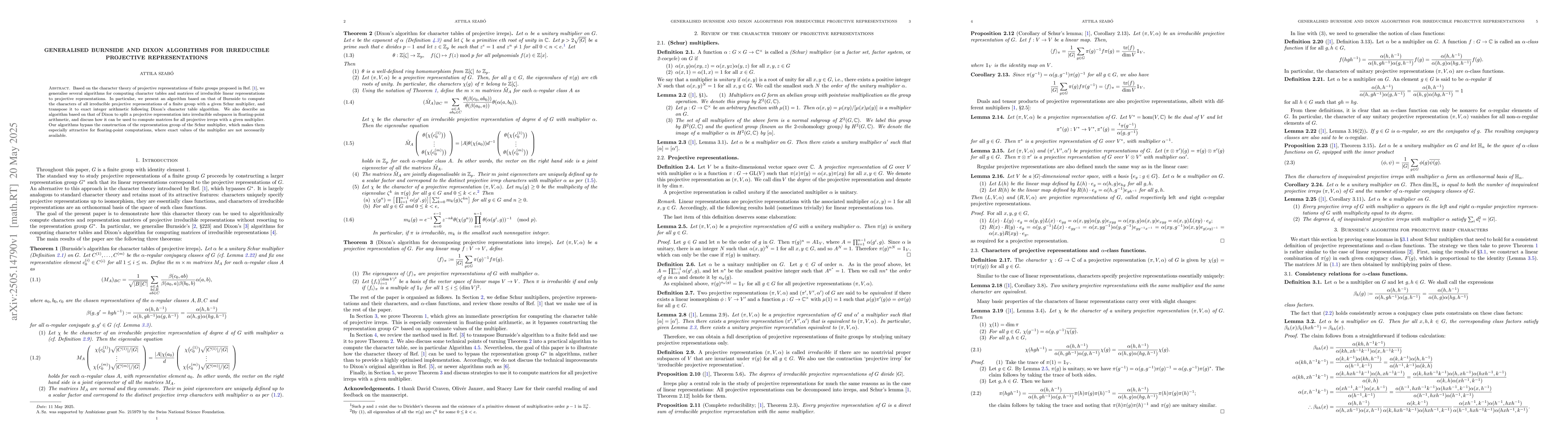 The paper introduces generalized Burnside and Dixon algorithms for computing characters and matrices of irreducible projective representations, tailored for exact and floating-point arithmetic, bypassing the construction of the Schur multiplier representation group.