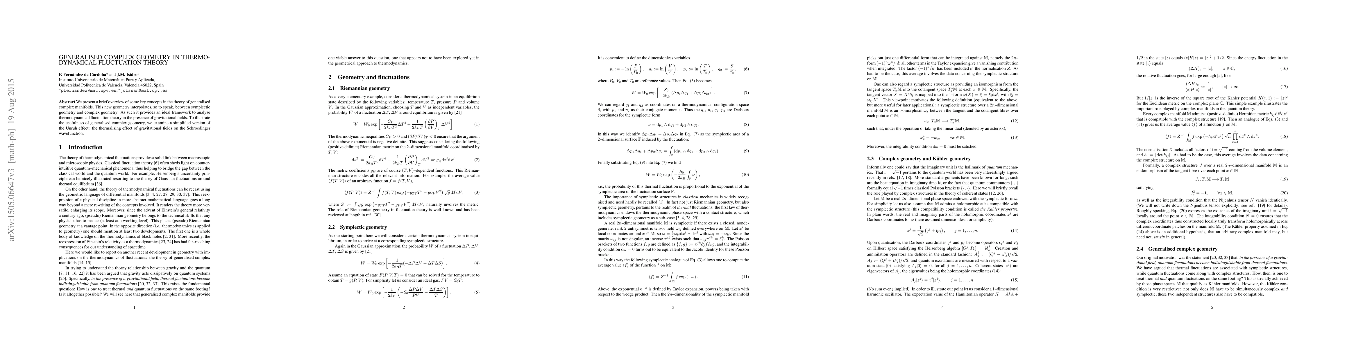 We present a brief overview of some key concepts in the theory of generalised complex manifolds. This new geometry interpolates, so to speak, between symplectic geometry and complex geometry. As such it provides an ideal framework to analyse thermodynamical fluctuation theory in the presence of gravitational fields. To illustrate the usefulness of generalised complex geometry, we examine a simplified version of the Unruh effect: the thermalising effect of gravitational fields on the Schroedinger wavefunction.