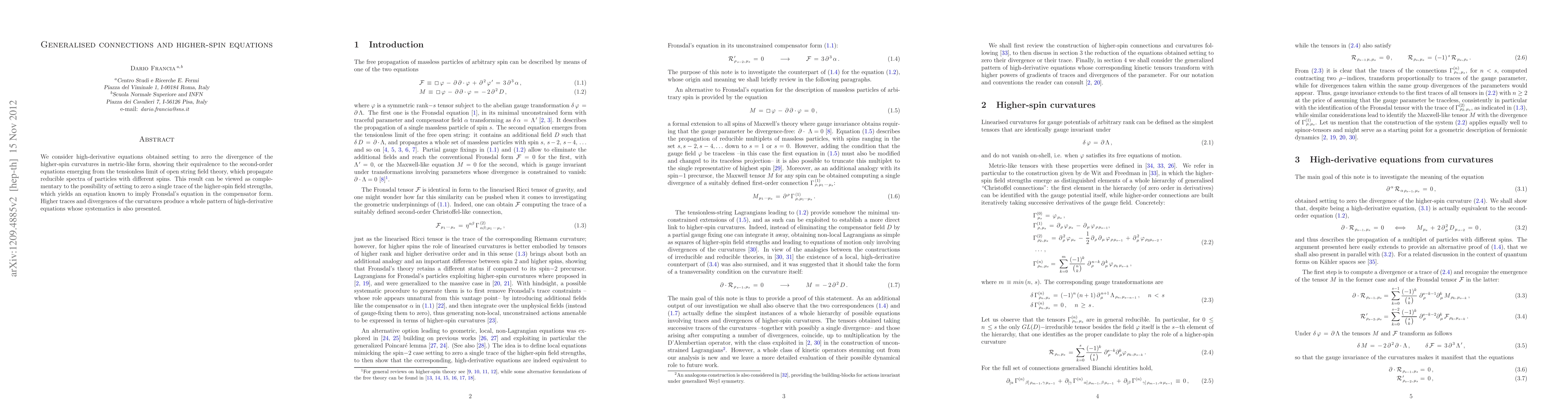 We consider high-derivative equations obtained setting to zero the divergence of the higher-spin curvatures in metric-like form, showing their equivalence to the second-order equations emerging from the tensionless limit of open string field theory, which propagate reducible spectra of particles with different spins. This result can be viewed as complementary to the possibility of setting to zero a single trace of the higher-spin field strengths, which yields an equation known to imply Fronsdal's equation in the compensator form. Higher traces and divergences of the curvatures produce a whole pattern of high-derivative equations whose systematics is also presented.