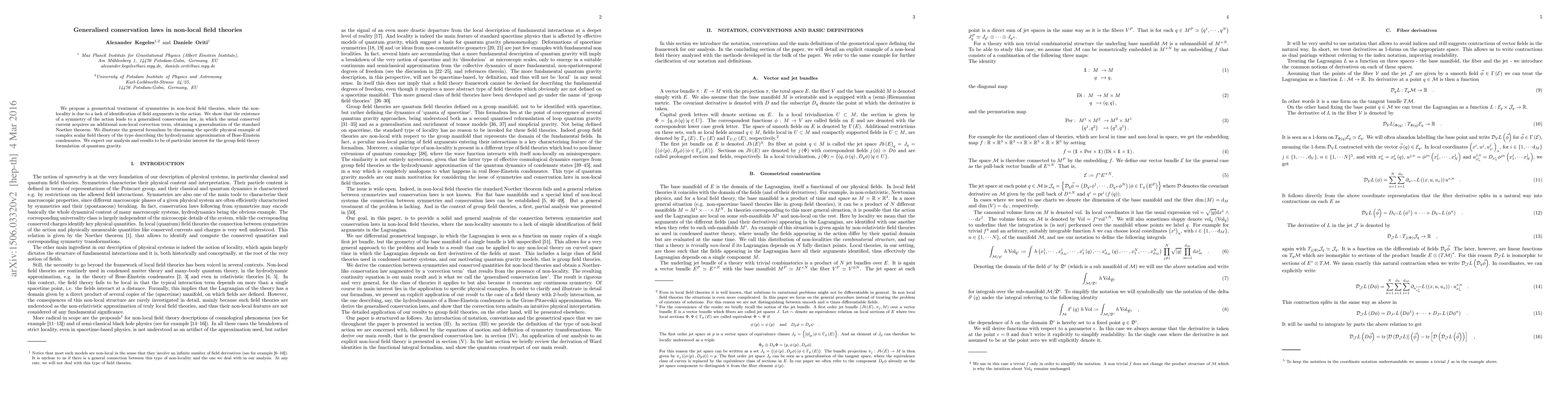 We propose a geometrical treatment of symmetries in non-local field theories, where the non-locality is due to a lack of identification of field arguments in the action. We show that the existence of a symmetry of the action leads to a generalised conservation law, in which the usual conserved current acquires an additional non-local correction term, obtaining a generalisation of the standard Noether theorem. We illustrate the general formalism by discussing the specific physical example of complex scalar field theory of the type describing the hydrodynamic approximation of Bose-Einstein condensates. We expect our analysis and results to be of particular interest for the group field theory formulation of quantum gravity.