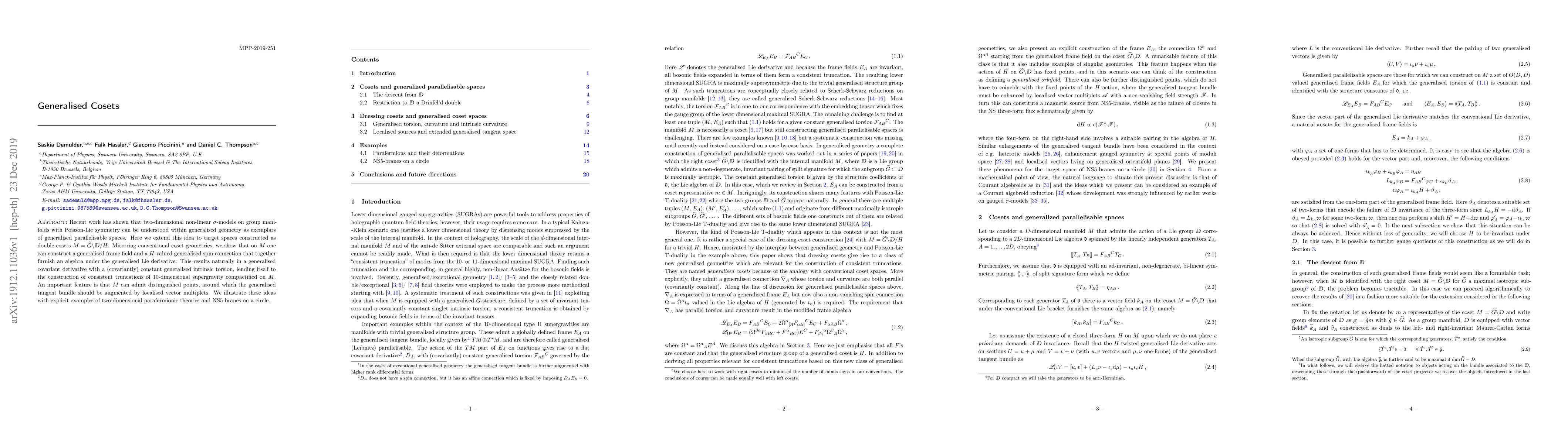 Recent work has shown that two-dimensional non-linear $\sigma$-models on group manifolds with Poisson-Lie symmetry can be understood within generalised geometry as exemplars of generalised parallelisable spaces. Here we extend this idea to target spaces constructed as double cosets $M=\widetilde{G} \backslash D / H$. Mirroring conventional coset geometries, we show that on $M$ one can construct a generalised frame field and a $H$-valued generalised spin connection that together furnish an algebra under the generalised Lie derivative. This results naturally in a generalised covariant derivative with a (covariantly) constant generalised intrinsic torsion, lending itself to the construction of consistent truncations of 10-dimensional supergravity compactified on $M$. An important feature is that $M$ can admit distinguished points, around which the generalised tangent bundle should be augmented by localised vector multiplets. We illustrate these ideas with explicit examples of two-dimensional parafermionic theories and NS5-branes on a circle.