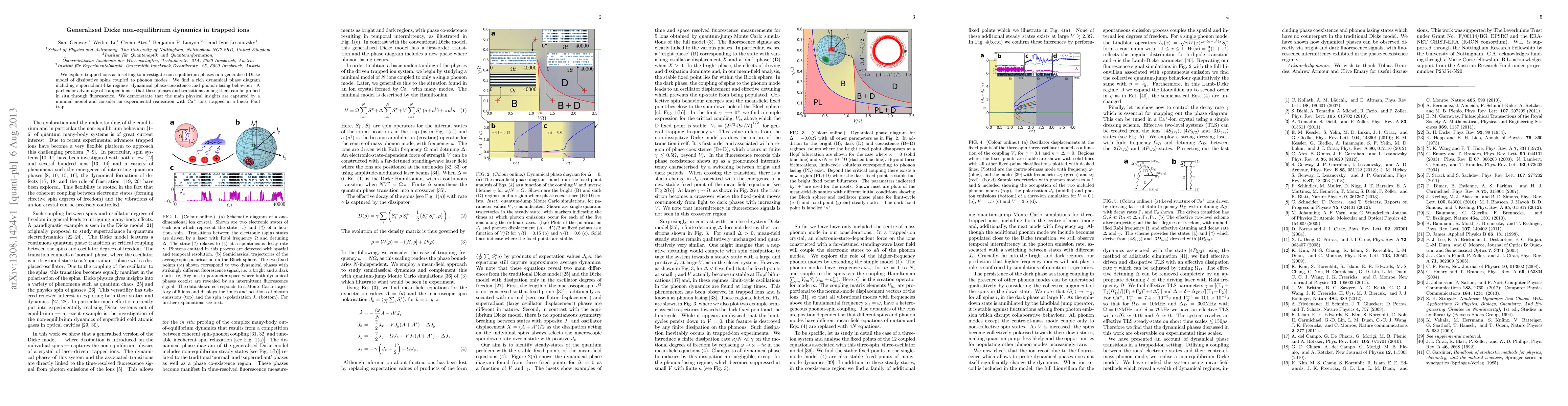 This paper investigates non-equilibrium dynamics in trapped ions using a generalised Dicke model, revealing a complex phase diagram with superradiant regimes, phase coexistence, and phonon lasing. The study highlights the potential of in situ fluorescence probing of these phenomena in Ca+ ions within a linear Paul trap.