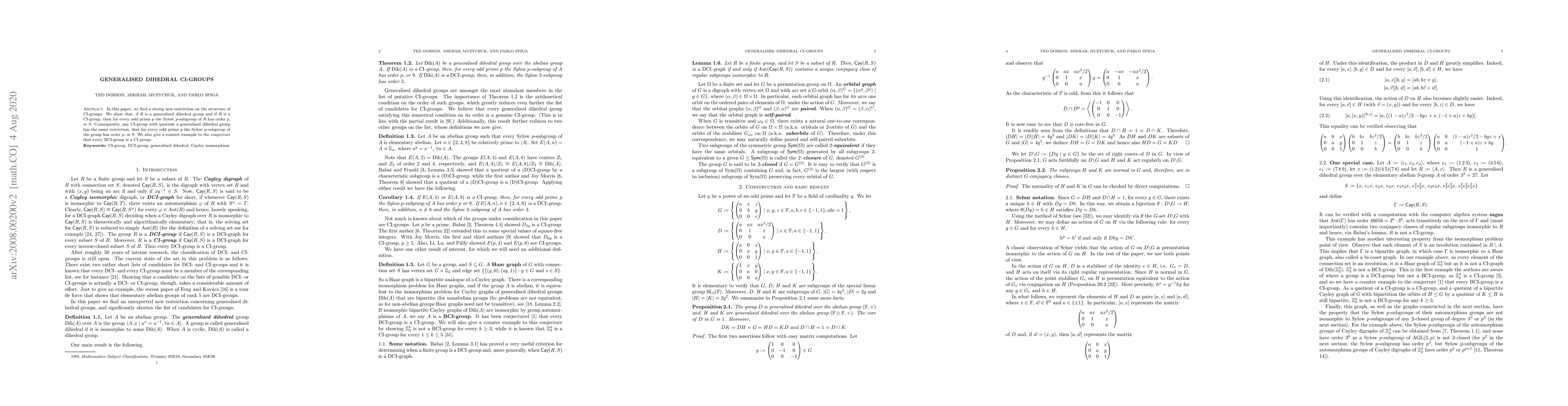In this paper, we find a strong new restriction on the structure of CI-groups. We show that, if $R$ is a generalised dihedral group and if $R$ is a CI-group, then for every odd prime $p$ the Sylow $p$-subgroup of $R$ has order $p$, or $9$. Consequently, any CI-group with quotient a generalised dihedral group has the same restriction, that for every odd prime $p$ the Sylow $p$-subgroup of the group has order $p$, or $9$. We also give a counter example to the conjecture that every BCI-group is a CI-group.