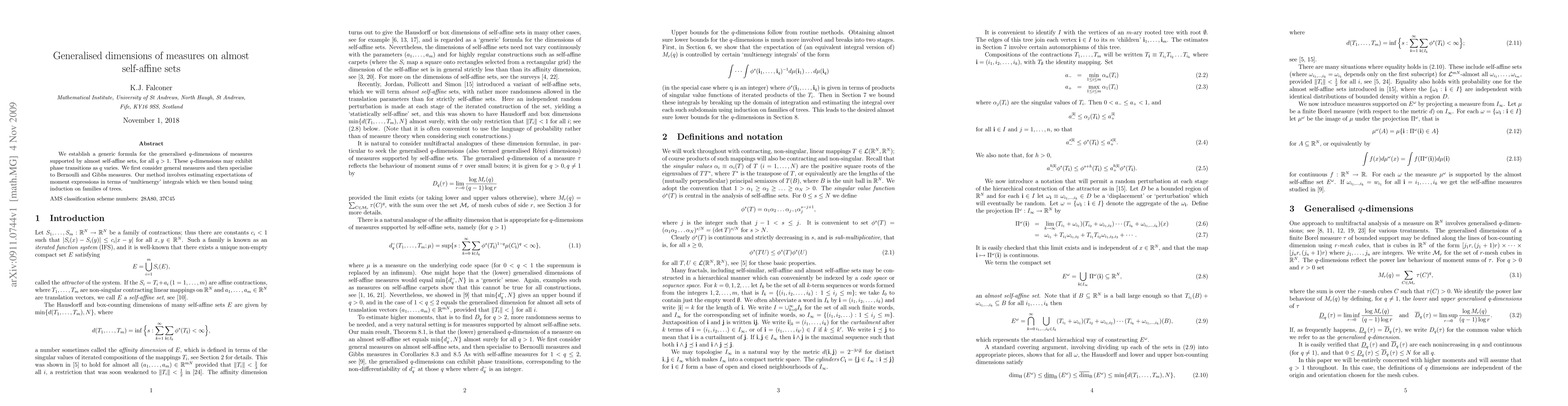 This paper develops a formula for generalised q-dimensions of measures on almost self-affine sets, showing potential phase transitions with varying q. The method uses multienergy integrals and tree induction to estimate moment expressions for both general and specific measures like Bernoulli and Gibbs.