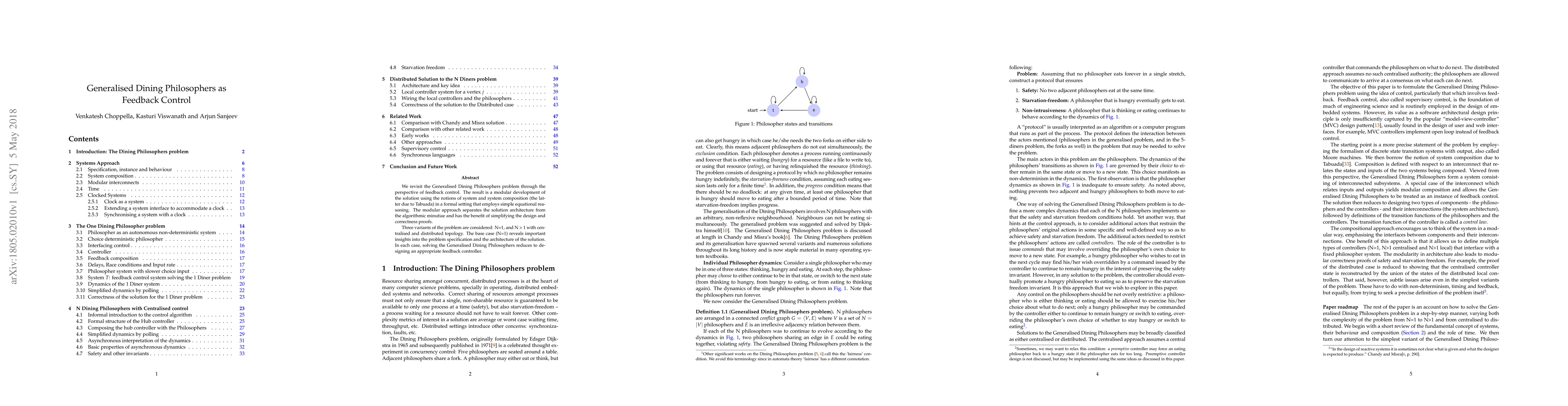 We revisit the Generalised Dining Philosophers problem through the perspective of feedback control. The result is a modular development of the solution using the notions of system and system composition (the latter due to Tabuada) in a formal setting that employs simple equational reasoning. The modular approach separates the solution architecture from the algorithmic minutiae and has the benefit of simplifying the design and correctness proofs. Three variants of the problem are considered: N=1, and N>1 with centralised and distributed topology. The base case (N=1) reveals important insights into the problem specification and the architecture of the solution. In each case, solving the Generalised Dining Philosophers reduces to designing an appropriate feedback controller.