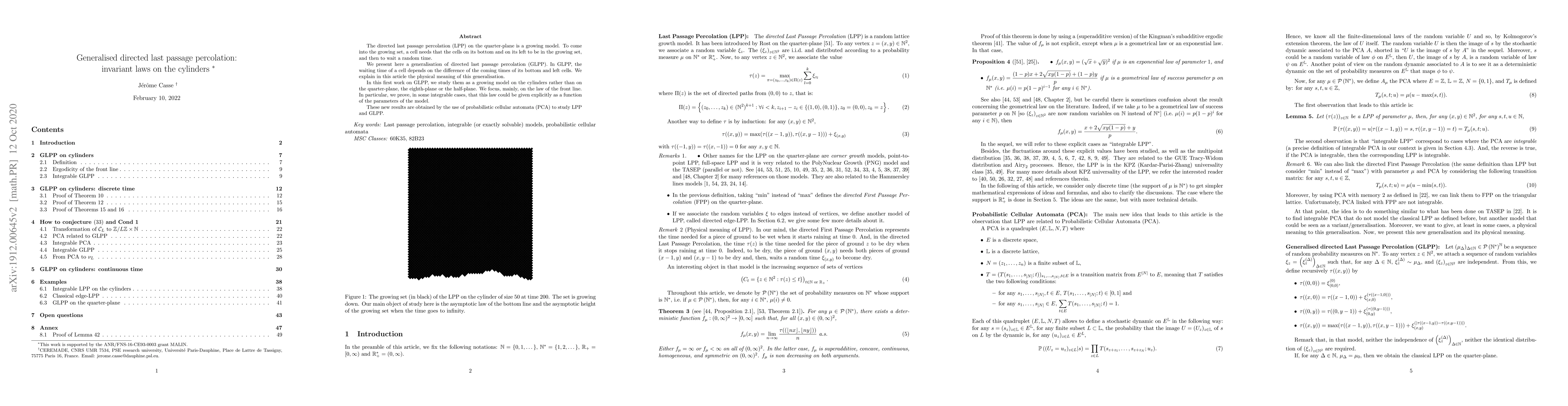 The directed last passage percolation (LPP) on the quarter-plane is a growing model. To come into the growing set, a cell needs that the cells on its bottom and on its left to be in the growing set, and then to wait a random time. We present here a generalisation of directed last passage percolation (GLPP). In GLPP, the waiting time of a cell depends on the difference of the coming times of its bottom and left cells. We explain in this article the physical meaning of this generalisation. In this first work on GLPP, we study them as a growing model on the cylinders rather than on the quarter-plane, the eighth-plane or the half-plane. We focus, mainly, on the law of the front line. In particular, we prove, in some integrable cases, that this law could be given explicitly as a function of the parameters of the model. These new results are obtained by the use of probabilistic cellular automata (PCA) to study LPP and GLPP.