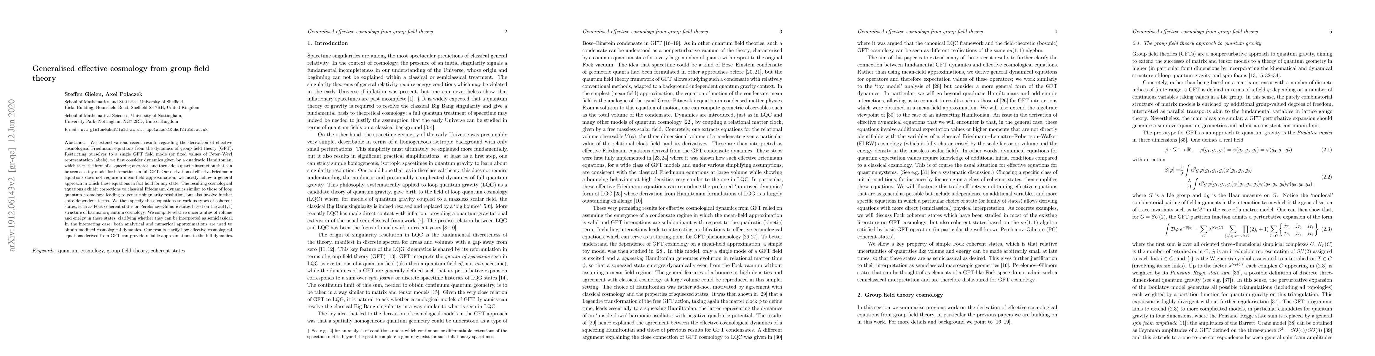 We extend various recent results regarding the derivation of effective cosmological Friedmann equations from the dynamics of group field theory (GFT). Restricting ourselves to a single GFT field mode (or fixed values of Peter-Weyl representation labels), we first consider dynamics given by a quadratic Hamiltonian, which takes the form of a squeezing operator, and then add a quartic interaction that can be seen as a toy model for interactions in full GFT. Our derivation of effective Friedmann equations does not require a mean-field approximation; we mostly follow a general approach in which these equations in fact hold for any state. The resulting cosmological equations exhibit corrections to classical Friedmann dynamics similar to those of loop quantum cosmology, leading to generic singularity resolution, but also involve further state-dependent terms. We then specify these equations to various types of coherent states, such as Fock coherent states or Perelomov-Gilmore states based on the su(1,1) structure of harmonic quantum cosmology. We compute relative uncertainties of volume and energy in these states, clarifying whether they can be interpreted as semiclassical. In the interacting case, both analytical and numerical approximations are used to obtain modified cosmological dynamics. Our results clarify how effective cosmological equations derived from GFT can provide reliable approximations to the full dynamics.