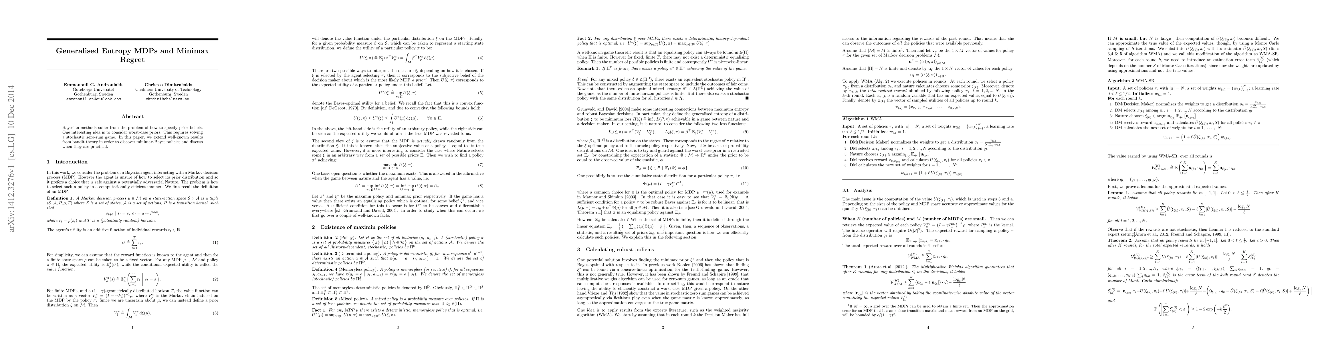 Bayesian methods suffer from the problem of how to specify prior beliefs. One interesting idea is to consider worst-case priors. This requires solving a stochastic zero-sum game. In this paper, we extend well-known results from bandit theory in order to discover minimax-Bayes policies and discuss when they are practical.