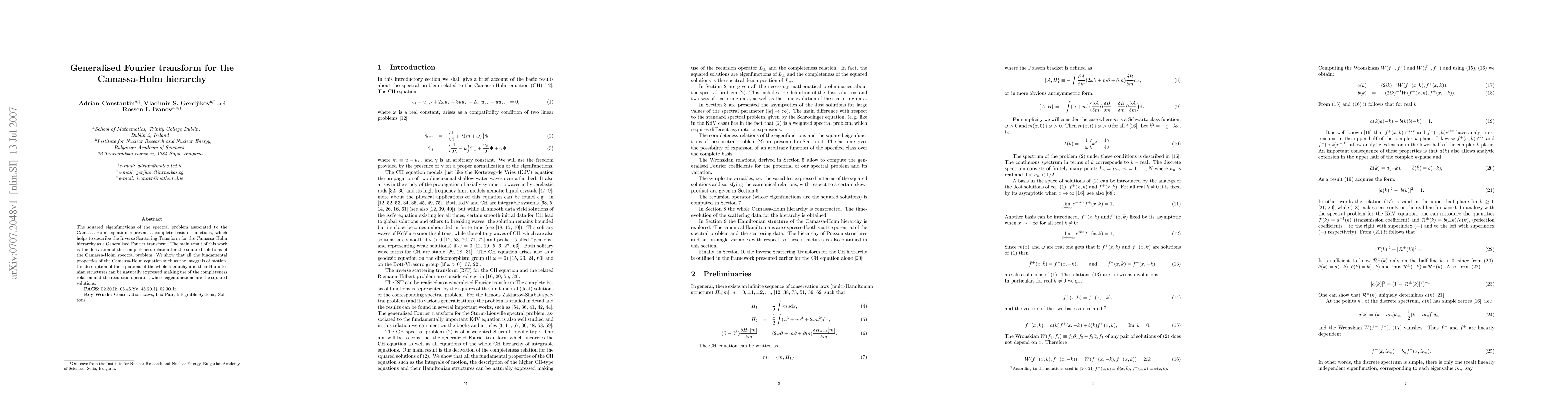 The squared eigenfunctions of the spectral problem associated to the Camassa-Holm equation represent a complete basis of functions, which helps to describe the Inverse Scattering Transform for the Camassa-Holm hierarchy as a Generalised Fourier transform. The main result of this work is the derivation of the completeness relation for the squared solutions of the Camassa-Holm spectral problem. We show that all the fundamental properties of the Camassa-Holm equation such as the integrals of motion, the description of the equations of the whole hierarchy and their Hamiltonian structures can be naturally expressed making use of the completeness relation and the recursion operator, whose eigenfunctions are the squared solutions.