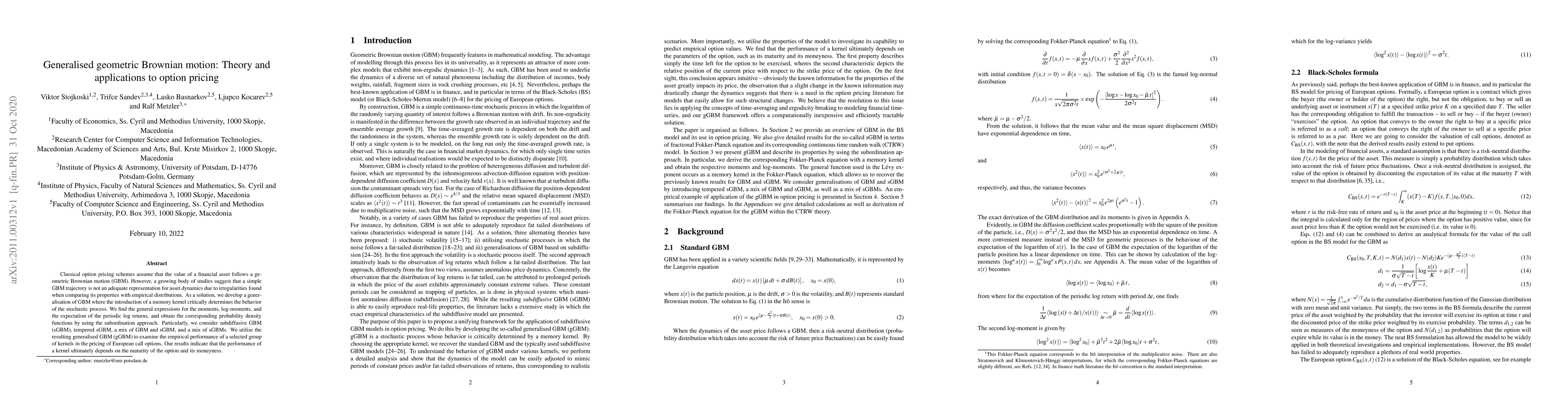 This paper generalises geometric Brownian motion to better model financial asset dynamics, introducing memory kernels to improve fit to empirical data. The authors derive expressions for moments and probability densities using subordination, and apply the generalised model to improve European call option pricing, showing that kernel performance varies with option maturity and moneyness.