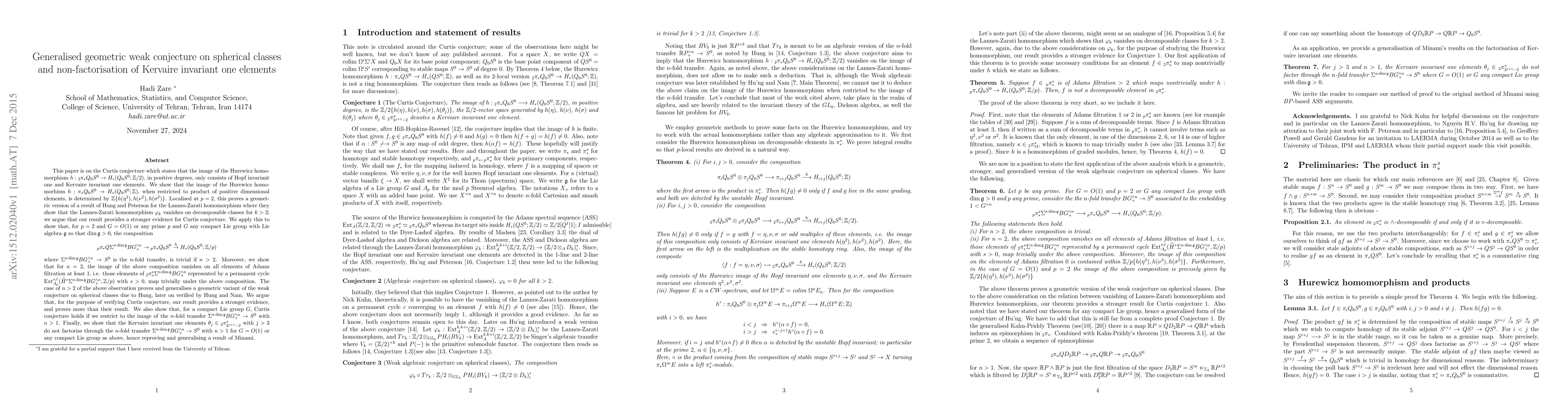 This paper is on the Curtis conjecture. We show that the image of the Hurewicz homomorhism $h:\pi_*Q_0S^0\to H_*(Q_0S^0;\mathbb{Z})$, when restricted to product of positive dimensional elements, is determined by $\mathbb{Z}\{h(\eta^2),h(\nu^2),h(\sigma^2)\}$. Localised at $p=2$, this proves a geometric version of a result of Hung and Peterson for the Lannes-Zarati homomorphism. We apply this to show that, for $p=2$ and $G=O(1)$ or any prime $p$ and $G$ any compact Lie group with Lie algebra $\mathfrak{g}$ so that $\dim\mathfrak{g}>0$, the composition $${_p\pi_*}Q\Sigma^{n\dim\mathfrak{g}}BG_+^{\wedge n}\to {_p\pi_*}Q_0S^0\stackrel{h}{\to}H_*(Q_0S^0;\mathbb{Z}/p)$$ where $\Sigma^{n\dim\mathfrak{g}}BG_+^{\wedge n}\to S^0$ is the $n$-fold transfer, is trivial if $n>2$. Moreover, we show that for $n=2$, the image of the above composition vanishes on all elements of Adams filtration at least $1$, i.e. those elements of ${_2\pi_*^s}\Sigma^{n\dim\mathfrak{g}}BG_+^{\wedge n}$ represented by a permanent cycle $\mathrm{Ext}_{A_p}^{s,t}(\widetilde{H}^*\Sigma^{n\dim\mathfrak{g}}BG_+^{\wedge n},\mathbb{Z}/p)$ with $s>0$, map trivially under the above composition. The case of $n>2$ of the above observation proves and generalises a geometric variant of the weak conjecture on spherical classes due to Hung, later on verified by Hung and Nam. We also show that, for a compact Lie group $G$, Curtis conjecture holds if we restrict to the image of the $n$-fold transfer $\Sigma^{n\dim\mathfrak{g}}BG_+^{\wedge n}\to S^0$ with $n>1$. Finally, we show that the Kervaire invariant one elements $\theta_j\in{_2\pi_{2^{j+1}-2}^s}$ with $j>3$ do not factorise through the $n$-fold transfer $\Sigma^{n\dim\mathfrak{g}}BG_+^{\wedge n}\to S^0$ with $n>1$ for $G=O(1)$ or any compact Lie group as above.